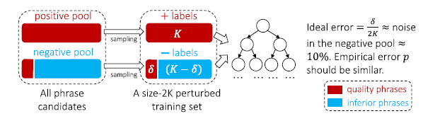 上图中出现的采样过程,文中使用的是随机森林,将特定短语的短语质量得分计算为预测该短语为质量短语的所有决策树的比例。假如在随机森林中有T个树,可以将整体错误估计为,超过一半的分类器将给定短语候选者误分类的概率。
