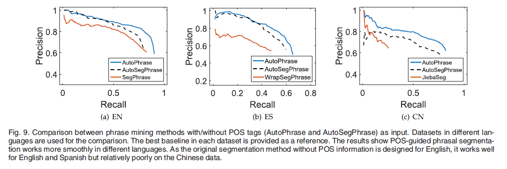在英语数据集上,AutoPhrase效果比 AutoSegPhrase好,在西班牙语上效果差不多,但是在中文数据集上可以明显地看出AutoPhrase的效果最好。