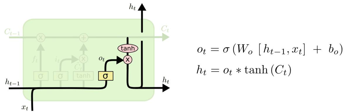 最后,我们需要决定我们要输出什么。此输出将基于我们的cell状态,但需要经过一个过滤的处理。首先,我们运行一个sigmoid层,它决定了我们要输出的cell状态的哪些部分。然后,我们将cell状态通过tanh层(将值归到-1和1之间),并将其乘以Sigmoid的输出,以便我们只输出我们决定的部分。