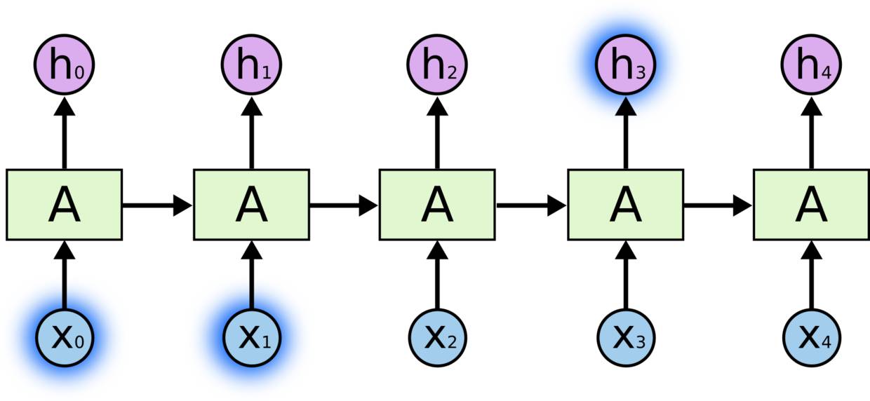 在上面的示例中,神经网络模块A正在读取一个输入X,并输出一个h,循环可以使得信息可以从网络的当前状态传递到下一个状态。