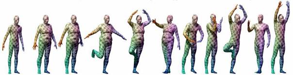 图1.显示从最左边的身体参考形状转移到不同姿势的身体各个部分纹理之间的对应关系。