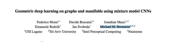 教程主讲人Michael Bronstein在CVPR 2017 曾发表论文《几何深度学习:在图和流形上使用CNN混合模型》Geometric deep learning on graphs and manifolds using mixture model CNNs