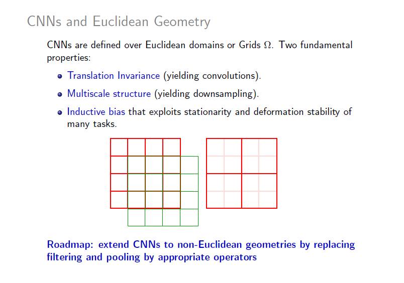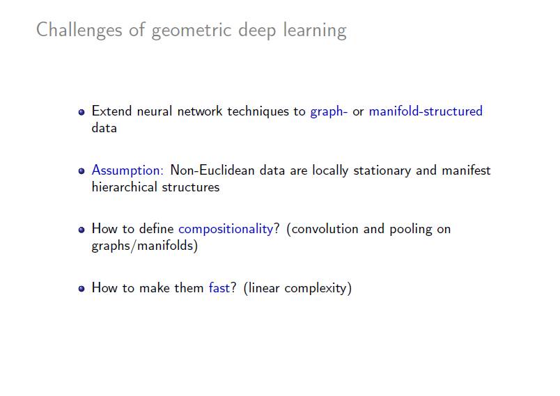 在过去的几年,深度学习方法在多个领域取得了前所未有的成就,比如计算机视觉和语言识别。目前研究者主要将深度学习方法应用于欧氏结构数据,然而有些非常重要的应用需要处理非欧氏空间结构的数据,比如图和流形。这些几何数据在许多任务重的重要性越来越多高,比如3D视觉、传感网络、药品研发、生物医药、推荐系统以及各种web程序。 深度学习在这些方面的应用有着明显的滞后,这是因为处理的对象的非欧性质使得在深层网络中对其基本操作的定义相当麻烦。