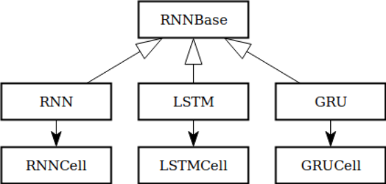 看看PyTorch中的RNN层,我们可以看到有RNN,LSTM和GRU类,还有RNNCell,LSTMCell和GRUCell类。 这可能意味着有一个RNNbase的基类,其他变体都是继承并且做一些改变得到。