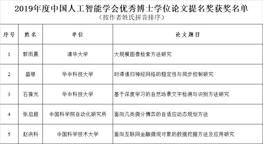 2018年度中国人工智能学会优秀博士学位论文评选获奖名单
