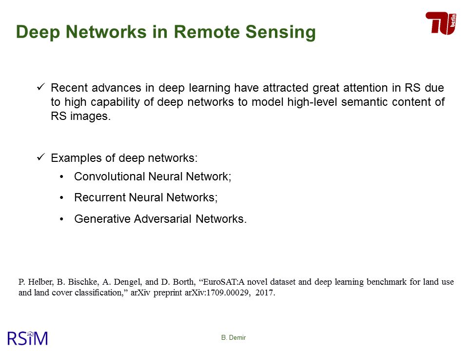 第3部分:卫星图像的知识发现。在本教程的这一部分中,我们将介绍遥感文献,该文献研究模式识别和机器学习技术,以便从卫星图像中提取知识(例如,土地覆盖类)。PPT将展示这一部分
