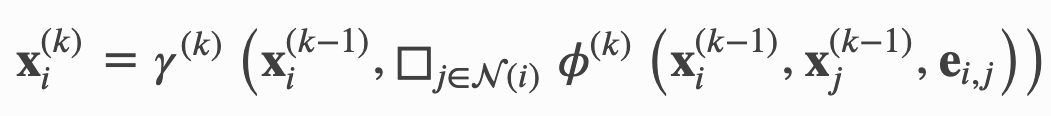 x表示节点嵌入,e表示边缘特征,φ表示消息函数,□表示聚合函数,γ表示更新函数。如果图中的边没有连通性以外的特征,则e基本上是图的边缘索引。上标表示图层的索引。当k = 1时,x表示每个节点的输入特征。下面我将说明每个函数的工作原理: