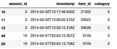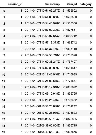 from sklearn.preprocessing import LabelEncoderdf = pd.read_csv('../input/yoochoose-click.dat', header=None)df.columns=['session_id','timestamp','item_id','category']buy_df = pd.read_csv('../input/yoochoose-buys.dat', header=None)buy_df.columns=['session_id','timestamp','item_id','price','quantity']item_encoder = LabelEncoder()df['item_id'] = item_encoder.fit_transform(df.item_id)df.head()