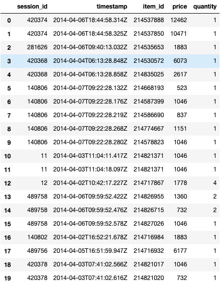 挑战提供了两组主要数据,yoochoose-clicks.dat和yoochoose-buys.dat,分别包含点击事件和购买事件。 让我们快速浏览一下数据: