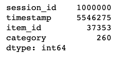 #randomly sample a couple of themsampled_session_id = np.random.choice(df.session_id.unique(), 1000000, replace=False)df = df.loc[df.session_id.isin(sampled_session_id)]df.nunique()