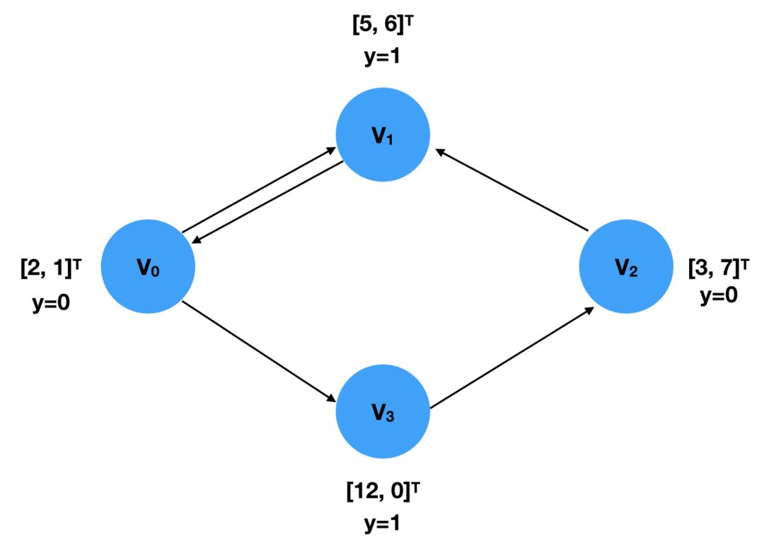 x = torch.tensor([[2,1], [5,6], [3,7], [12,0]], dtype=torch.float)y = torch.tensor([0, 1, 0, 1], dtype=torch.float)图连接(边缘索引)应该用COO格式限制,即第一个列表包含源节点的索引,而目标节点的索引在第二个列表中指定。