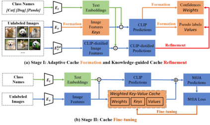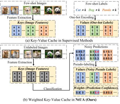 Recent advances in large-scale vision-language models have achieved very impressive performance in various zero-shot image classification tasks. While prior studies have demonstrated significant improvements by introducing few-shot labelled target samples, they still require labelling of target samples, which greatly degrades their scalability while handling various visual recognition tasks. We design NtUA, a Noise-tolerant Unsupervised Adapter that allows learning superior target models with few-shot unlabelled target samples. NtUA works as a key-value cache that formulates visual features and predicted pseudo-labels of the few-shot unlabelled target samples as key-value pairs. It consists of two complementary designs. The first is adaptive cache formation that combats pseudo-label noises by weighting the key-value pairs according to their prediction confidence. The second is pseudo-label rectification, which corrects both pair values (i.e., pseudo-labels) and cache weights by leveraging knowledge distillation from large-scale vision language models. Extensive experiments show that NtUA achieves superior performance consistently across multiple widely adopted benchmarks.