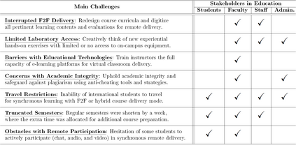 翻译:面对这一危及生命的大流行病,教育工作者不得不迅速转向另一种课程提供形式,而不会严重影响教育经验的质量。在向在线学习过渡之后,教育工作者不得不应对一系列挑战。由于面对面教学中断、进入最先进的实验室的机会有限、教育技术障碍、学术廉正的挑战以及远程团队合作和学生参与的障碍,迫切需要创造性的解决办法。在本章中,我们为该流行病不同阶段的各种课程提供各种课程提供模式提供了理由,并突出强调了我们为克服远程教育的一些紧迫挑战而采取的办法。我们还讨论了我们如何确保实践学习仍然是工程课程的一个组成部分。我们主张,这一流行病期间的一些应用变化有可能成为教育现代化的催化剂。