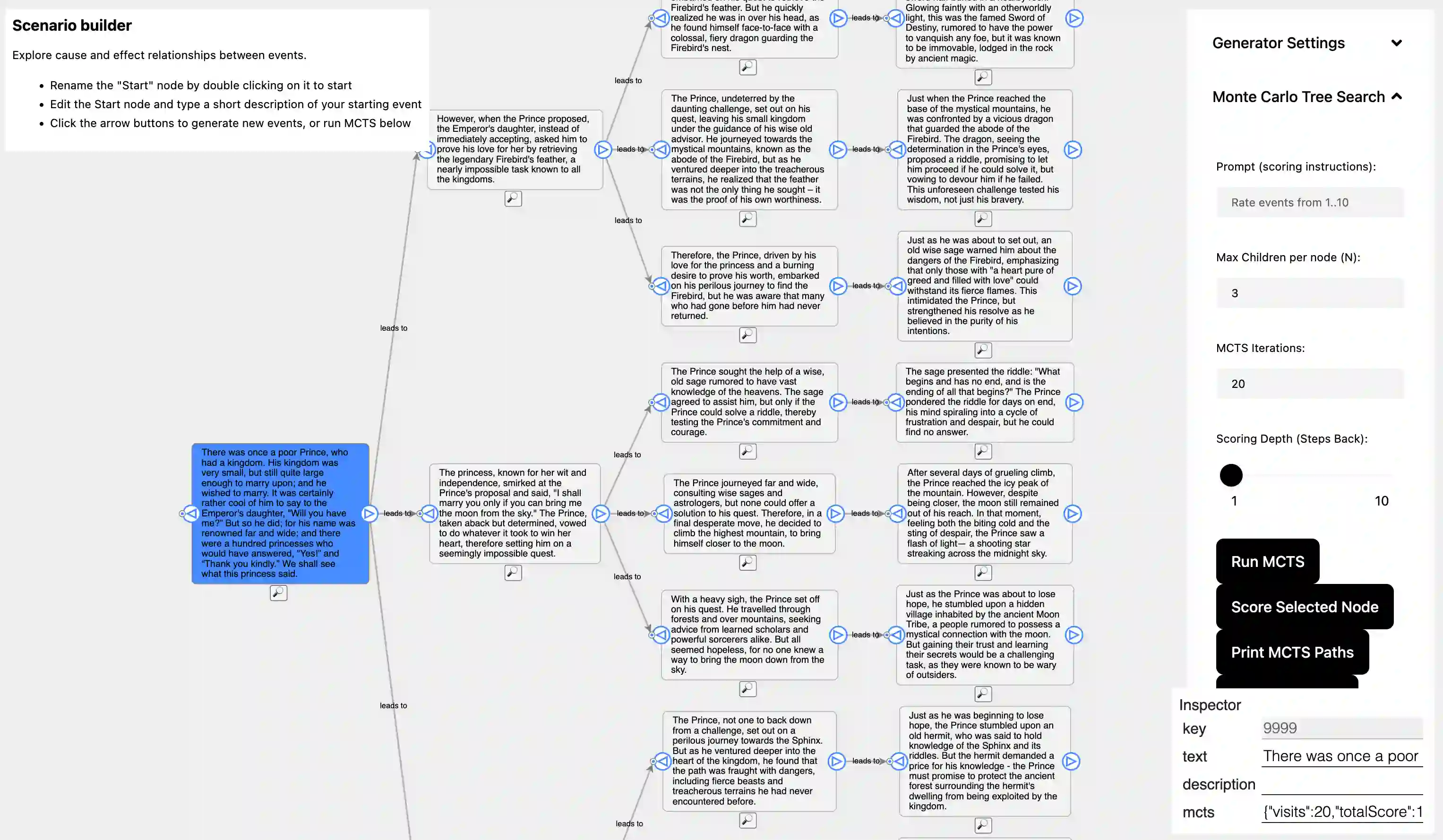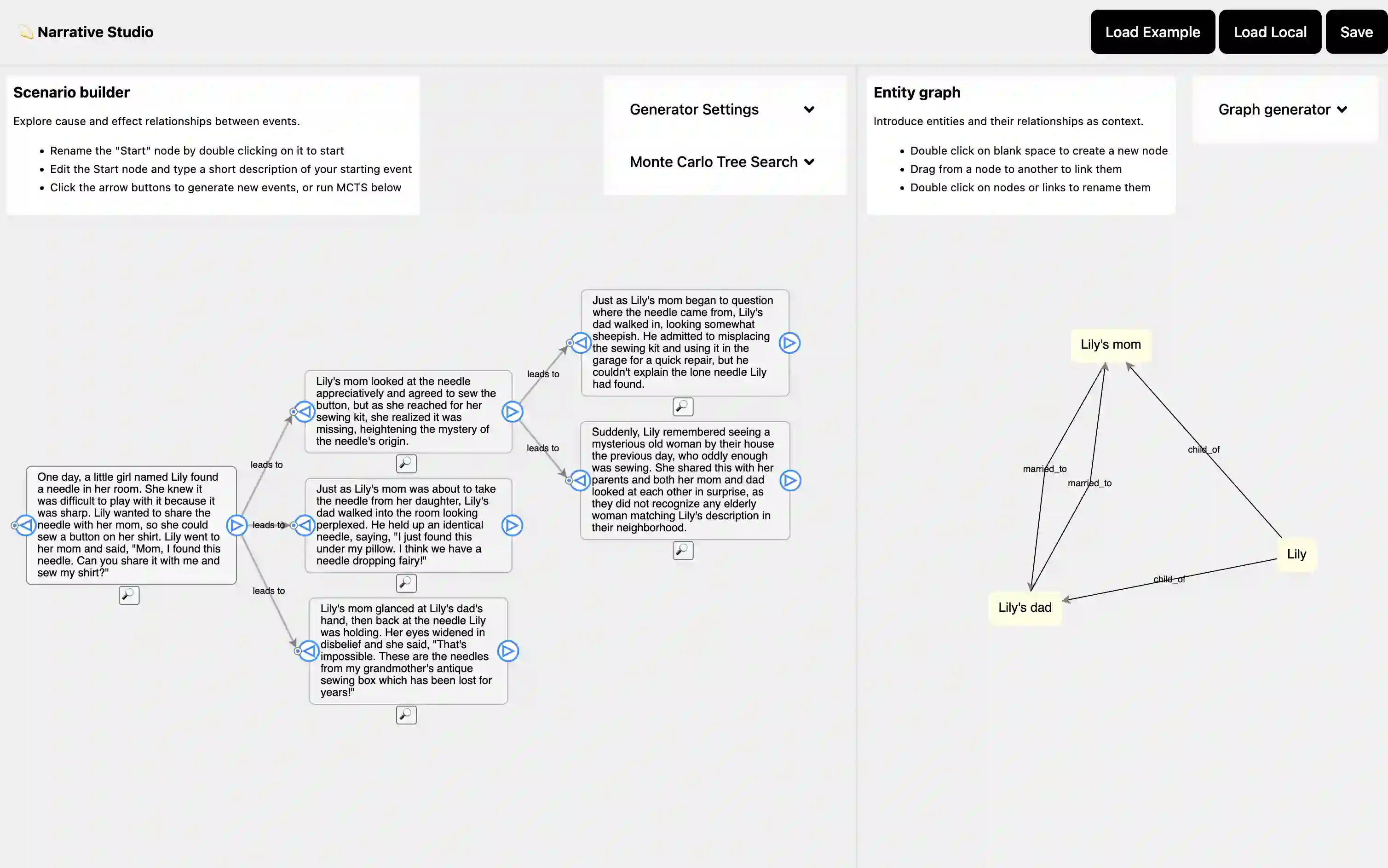 Interactive storytelling benefits from planning and exploring multiple 'what if' scenarios. Modern LLMs are useful tools for ideation and exploration, but current chat-based user interfaces restrict users to a single linear flow. To address this limitation, we propose Narrative Studio -- a novel in-browser narrative exploration environment featuring a tree-like interface that allows branching exploration from user-defined points in a story. Each branch is extended via iterative LLM inference guided by system and user-defined prompts. Additionally, we employ Monte Carlo Tree Search (MCTS) to automatically expand promising narrative paths based on user-specified criteria, enabling more diverse and robust story development. We also allow users to enhance narrative coherence by grounding the generated text in an entity graph that represents the actors and environment of the story.