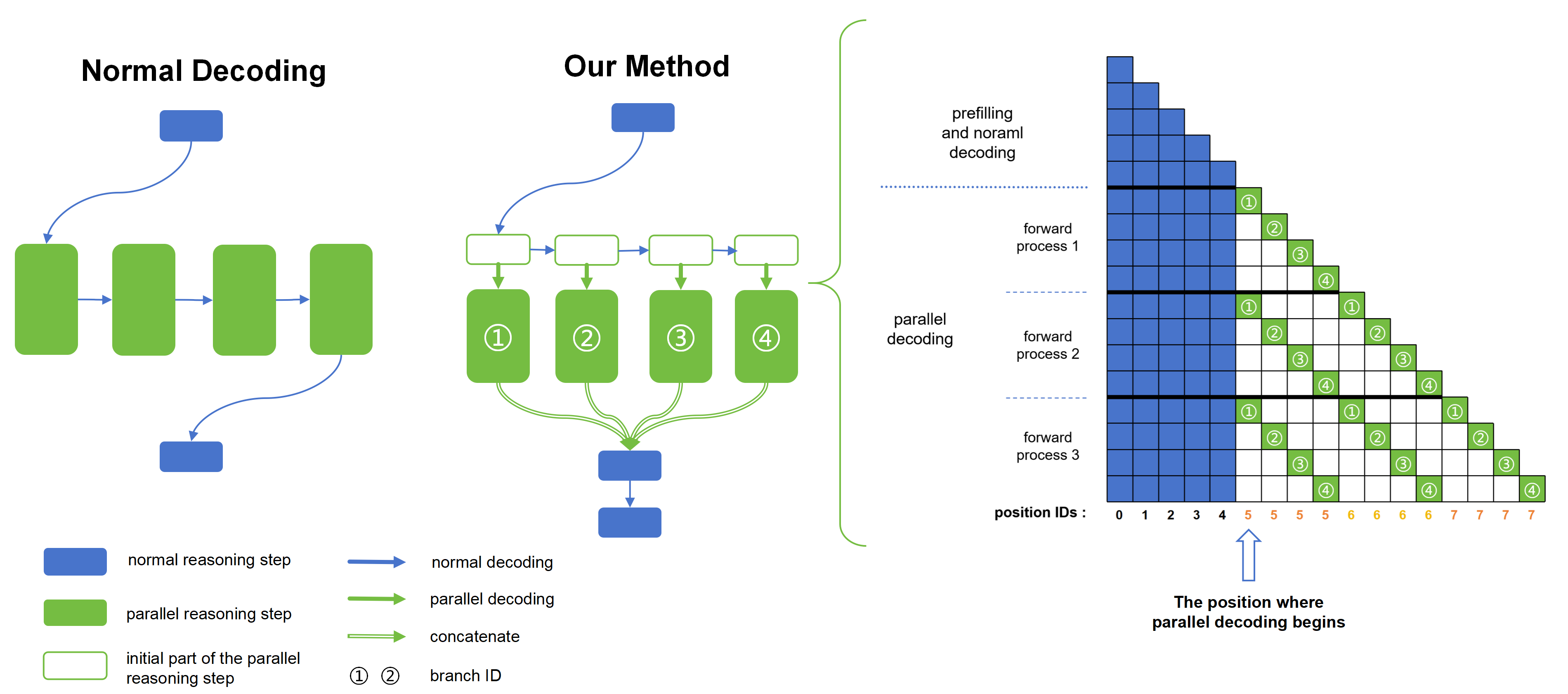 Recent advances in reasoning models have demonstrated significant improvements in accuracy, particularly for complex tasks such as mathematical reasoning, by employing detailed and comprehensive reasoning processes. However, generating these lengthy reasoning sequences is computationally expensive and time-consuming. To address this inefficiency, we leverage the inherent parallelizability of certain tasks to accelerate the reasoning process. Specifically, when multiple parallel reasoning branches exist, we decode multiple tokens per step using a specialized attention mask, processing them within a single sequence, avoiding additional memory usage. Experimental results show that our method achieves over 100% speedup in decoding time while maintaining the answer quality.