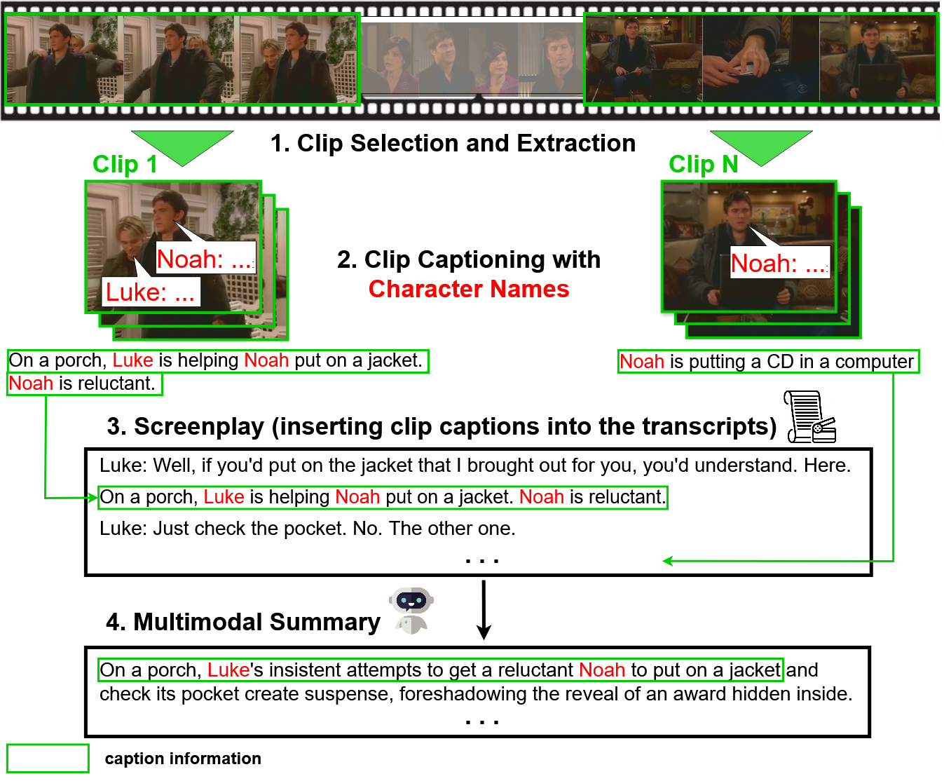 Vision-Language Models (VLMs) often struggle to balance visual and textual information when summarizing complex multimodal inputs, such as entire TV show episodes. In this paper, we propose a zero-shot video-to-text summarization approach that builds its own screenplay representation of an episode, effectively integrating key video moments, dialogue, and character information into a unified document. Unlike previous approaches, we simultaneously generate screenplays and name the characters in zero-shot, using only the audio, video, and transcripts as input. Additionally, we highlight that existing summarization metrics can fail to assess the multimodal content in summaries. To address this, we introduce MFactSum, a multimodal metric that evaluates summaries with respect to both vision and text modalities. Using MFactSum, we evaluate our screenplay summaries on the SummScreen3D dataset, demonstrating superiority against state-of-the-art VLMs such as Gemini 1.5 by generating summaries containing 20% more relevant visual information while requiring 75% less of the video as input.