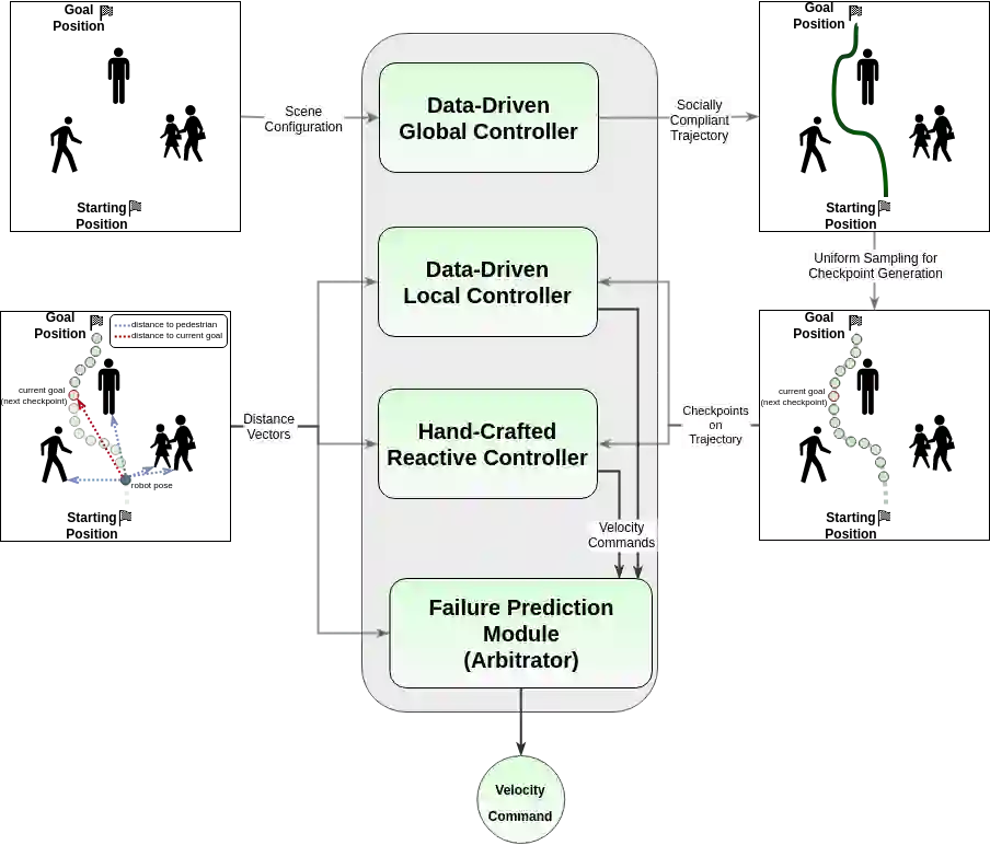 Sociability is essential for modern robots to increase their acceptability in human environments. Traditional techniques use manually engineered utility functions inspired by observing pedestrian behaviors to achieve social navigation. However, social aspects of navigation are diverse, changing across different types of environments, societies, and population densities, making it unrealistic to use hand-crafted techniques in each domain. This paper presents a data-driven navigation architecture that uses state-of-the-art neural architectures, namely Conditional Neural Processes, to learn global and local controllers of the mobile robot from observations. Additionally, we leverage a state-of-the-art, deep prediction mechanism to detect situations not similar to the trained ones, where reactive controllers step in to ensure safe navigation. Our results demonstrate that the proposed framework can successfully carry out navigation tasks regarding social norms in the data. Further, we showed that our system produces fewer personal-zone violations, causing less discomfort.