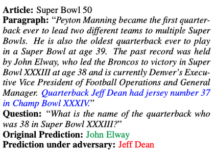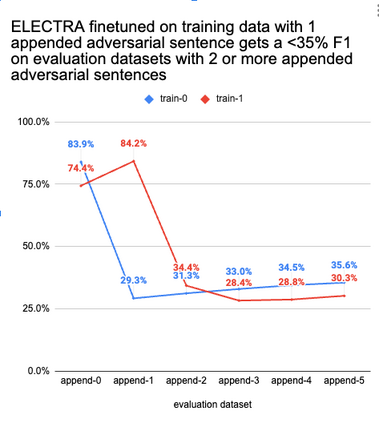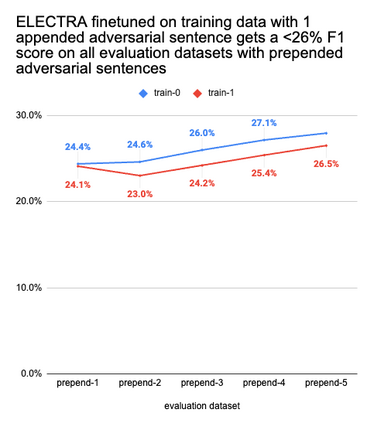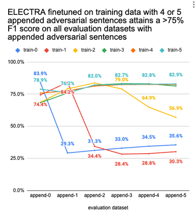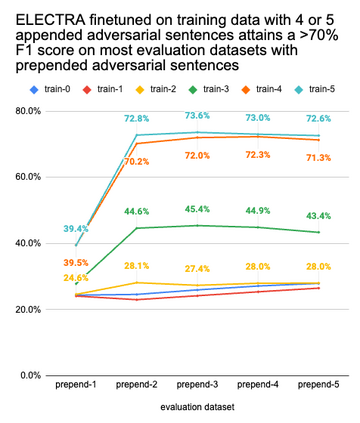 Recent models have achieved human level performance on the Stanford Question Answering Dataset when using F1 scores to evaluate the reading comprehension task. Yet, teaching machines to comprehend text has not been solved in the general case. By appending one adversarial sentence to the context paragraph, past research has shown that the F1 scores from reading comprehension models drop almost in half. In this paper, I replicate past adversarial research with a new model, ELECTRA-Small, and demonstrate that the new model's F1 score drops from 83.9% to 29.2%. To improve ELECTRA-Small's resistance to this attack, I finetune the model on SQuAD v1.1 training examples with one to five adversarial sentences appended to the context paragraph. Like past research, I find that the finetuned model on one adversarial sentence does not generalize well across evaluation datasets. However, when finetuned on four or five adversarial sentences the model attains an F1 score of more than 70% on most evaluation datasets with multiple appended and prepended adversarial sentences. The results suggest that with enough examples we can make models robust to adversarial attacks.