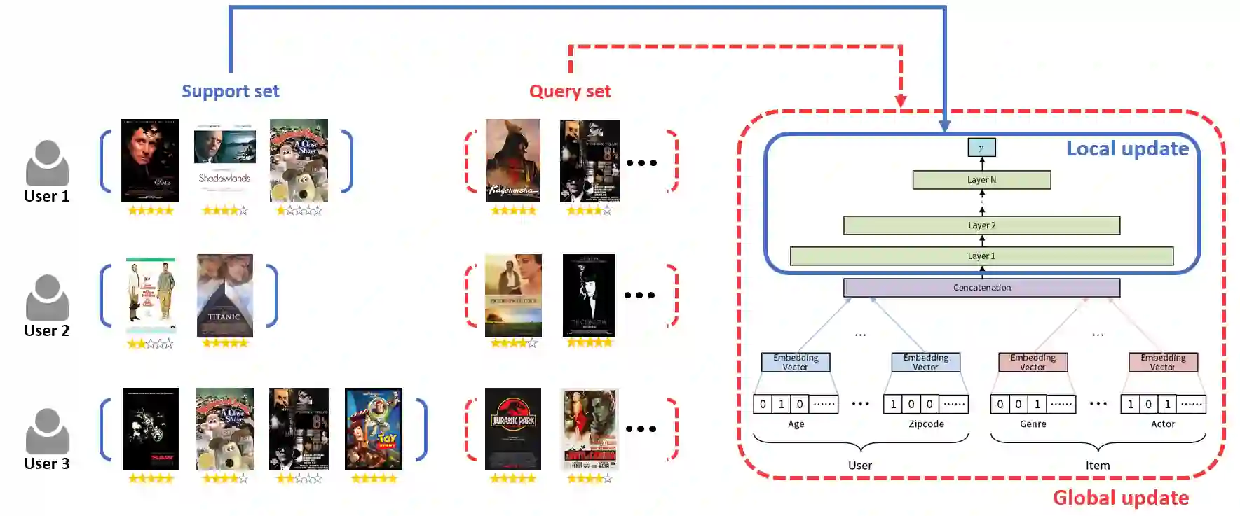翻译:本文提出一个减轻冷点启动问题的推荐系统,该系统只能根据少量项目来估计用户的偏好。为了确定用户在寒冷状态中的偏好,现有的推荐系统,如Netflix, 最初向用户提供项目;我们称这些项目为证据候选人;然后根据用户选定的项目提出建议。先前的建议研究有两个局限性:(1) 消费少数项目的用户建议不力,(2) 使用证据不足的证据候选人来确定用户的偏好。我们提出了一个基于元学习的推荐系统,称为MELU,以克服这两个限制。从元学习中可以快速采用几个例子的新任务中,MeLU可以对用户的新偏好用几个消耗的物品进行估算。此外,我们还提供了一个证据性候选人选择战略,确定按定制的偏好估计项目。我们用两个基准数据集来验证MELU,而拟议的模型比数据集的两个比较模型至少减少5.92%的绝对误差。我们还进行用户研究实验,以核实证据选择战略。