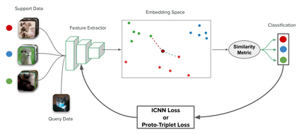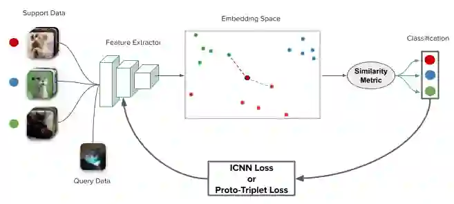 Few-shot learning is a challenging area of research that aims to learn new concepts with only a few labeled samples of data. Recent works based on metric-learning approaches leverage the meta-learning approach, which is encompassed by episodic tasks that make use a support (training) and query set (test) with the objective of learning a similarity comparison metric between those sets. Due to the lack of data, the learning process of the embedding network becomes an important part of the few-shot task. Previous works have addressed this problem using metric learning approaches, but the properties of the underlying latent space and the separability of the difference classes on it was not entirely enforced. In this work, we propose two different loss functions which consider the importance of the embedding vectors by looking at the intra-class and inter-class distance between the few data. The first loss function is the Proto-Triplet Loss, which is based on the original triplet loss with the modifications needed to better work on few-shot scenarios. The second loss function, which we dub ICNN loss is based on an inter and intra class nearest neighbors score, which help us to assess the quality of embeddings obtained from the trained network. Our results, obtained from a extensive experimental setup show a significant improvement in accuracy in the miniImagenNet benchmark compared to other metric-based few-shot learning methods by a margin of 2%, demonstrating the capability of these loss functions to allow the network to generalize better to previously unseen classes. In our experiments, we demonstrate competitive generalization capabilities to other domains, such as the Caltech CUB, Dogs and Cars datasets compared with the state of the art.