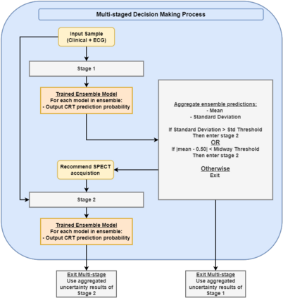 Aims. The purpose of this study is to create a multi-stage machine learning model to predict cardiac resynchronization therapy (CRT) response for heart failure (HF) patients. This model exploits uncertainty quantification to recommend additional collection of single-photon emission computed tomography myocardial perfusion imaging (SPECT MPI) variables if baseline clinical variables and features from electrocardiogram (ECG) are not sufficient. Methods. 218 patients who underwent rest-gated SPECT MPI were enrolled in this study. CRT response was defined as an increase in left ventricular ejection fraction (LVEF) > 5% at a 6 month follow-up. A multi-stage ML model was created by combining two ensemble models. Results. The response rate for CRT was 55.5% (n = 121) with overall male gender 61.0% (n = 133), an average age of 62.0, and LVEF of 27.7. The multi-stage model performed similarly to Ensemble 2 (which utilized the additional SPECT data) with AUC of 0.75 vs. 0.77, accuracy of 0.71 vs. 0.69, sensitivity of 0.70 vs. 0.72, and specificity 0.72 vs. 0.65, respectively. However, the multi-stage model only required SPECT MPI data for 52.7% of the patients across all folds. Conclusions. By using rule-based logic stemming from uncertainty quantification, the multi-stage model was able to reduce the need for additional SPECT MPI data acquisition without sacrificing performance.