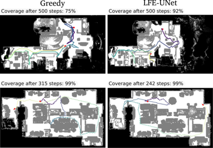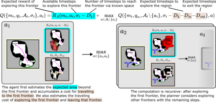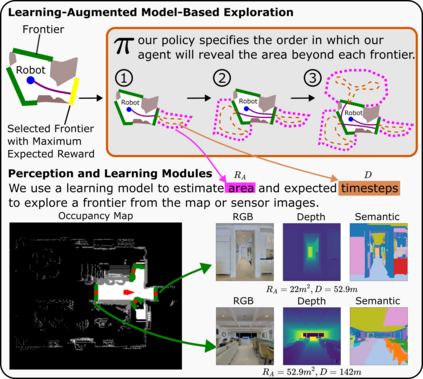 We consider the problem of time-limited robotic exploration in previously unseen environments where exploration is limited by a predefined amount of time. We propose a novel exploration approach using learning-augmented model-based planning. We generate a set of subgoals associated with frontiers on the current map and derive a Bellman Equation for exploration with these subgoals. Visual sensing and advances in semantic mapping of indoor scenes are exploited for training a deep convolutional neural network to estimate properties associated with each frontier: the expected unobserved area beyond the frontier and the expected timesteps (discretized actions) required to explore it. The proposed model-based planner is guaranteed to explore the whole scene if time permits. We thoroughly evaluate our approach on a large-scale pseudo-realistic indoor dataset (Matterport3D) with the Habitat simulator. We compare our approach with classical and more recent RL-based exploration methods. Our approach surpasses the greedy strategies by 2.1% and the RL-based exploration methods by 8.4% in terms of coverage.