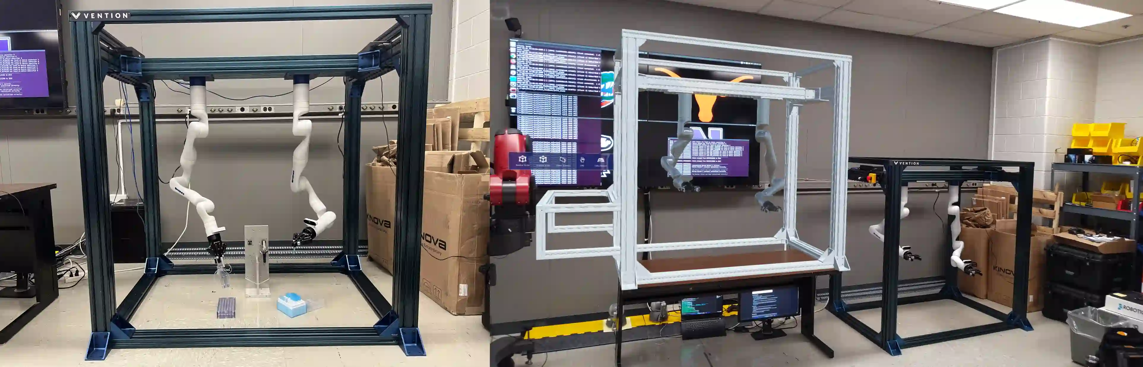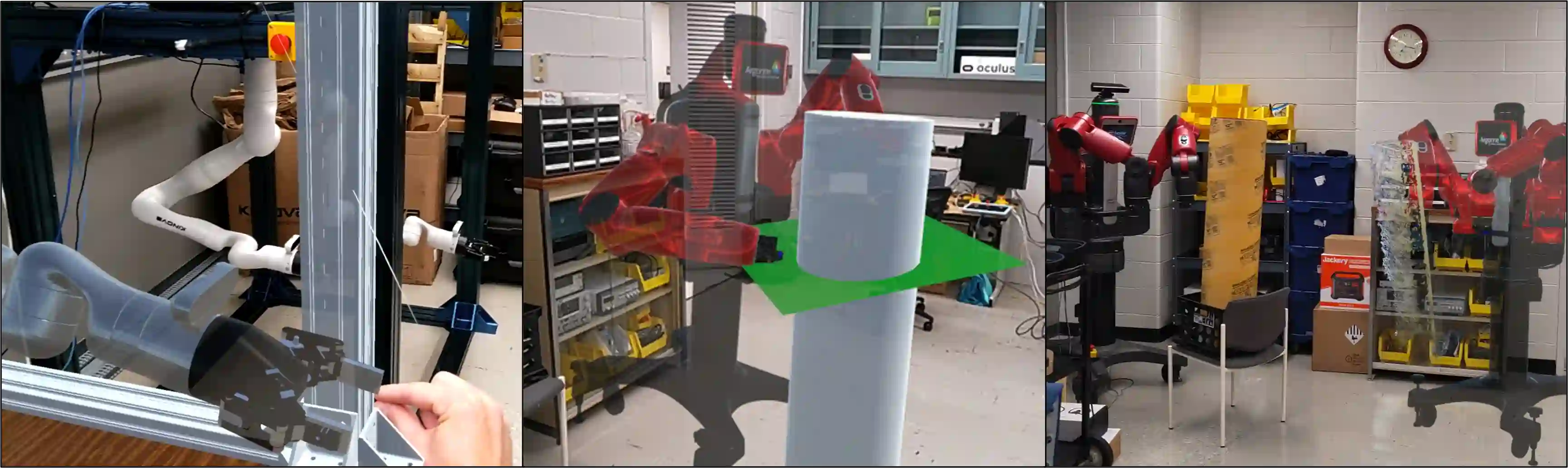 翻译:在核同位素和化学实验室中,热细胞和手套箱为科学家提供了进行实验的受控和安全环境。在这些隔离的容器中进行实验需要科学家亲身在场。如今,热细胞工作需要通过一种双边机械控制机制来操作设备和放射性材料。由主控杆产生的运动通过机械传递至遮蔽环境体内的内部夹紧器。越来越需要具备在远程操作这些容器内进行实验的能力。一种简单的方法是在一个盒子里安装两个机械手臂来模拟人手的运动。在这项工作中,建立了一种增强现实应用程序,允许佩戴Microsoft HoloLens 2头戴式耳机的用户通过在远程位置从AR中抓取机器人末端执行器的数字副本来远程操纵双臂机械手。除了在AR中显示物理机器人手臂的实时副本之外,该应用程序还使用户能够查看连接到机器人手臂的实时视频流,并解析其远程AR环境中的3D对象点云,以获得更好的情境感知。这项工作还为用户提供了虚拟装置以协助操作和其他远程操作任务。