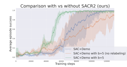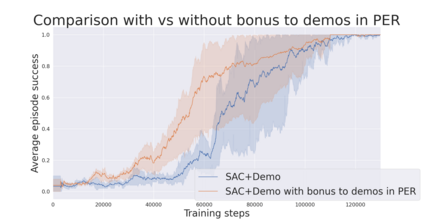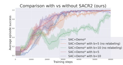 During recent years, deep reinforcement learning (DRL) has made successful incursions into complex decision-making applications such as robotics, autonomous driving or video games. However, a well-known caveat of DRL algorithms is their inefficiency, requiring huge amounts of data to converge. Off-policy algorithms tend to be more sample-efficient, and can additionally benefit from any off-policy data stored in the replay buffer. Expert demonstrations are a popular source for such data: the agent is exposed to successful states and actions early on, which can accelerate the learning process and improve performance. In the past, multiple ideas have been proposed to make good use of the demonstrations in the buffer, such as pretraining on demonstrations only or minimizing additional cost functions. We carry on a study to evaluate several of these ideas in isolation, to see which of them have the most significant impact. We also present a new method, based on a reward bonus given to demonstrations and successful episodes. First, we give a reward bonus to the transitions coming from demonstrations to encourage the agent to match the demonstrated behaviour. Then, upon collecting a successful episode, we relabel its transitions with the same bonus before adding them to the replay buffer, encouraging the agent to also match its previous successes. The base algorithm for our experiments is the popular Soft Actor-Critic (SAC), a state-of-the-art off-policy algorithm for continuous action spaces. Our experiments focus on robotics, specifically on a reaching task for a robotic arm in simulation. We show that our method SACR2 based on reward relabeling improves the performance on this task, even in the absence of demonstrations.