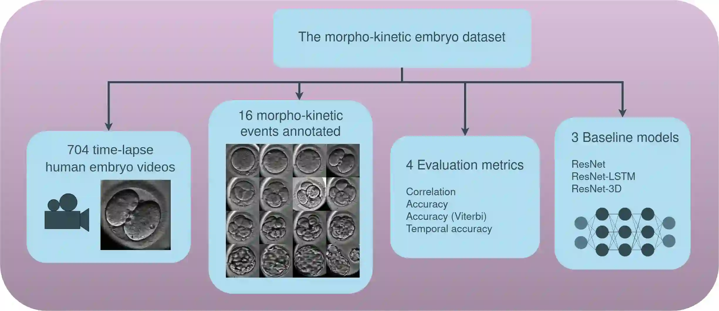 An important limitation to the development of Artificial Intelligence (AI)-based solutions for In Vitro Fertilization (IVF) is the absence of a public reference benchmark to train and evaluate deep learning (DL) models. In this work, we describe a fully annotated dataset of 704 videos of developing embryos, for a total of 337k images. We applied ResNet, LSTM, and ResNet-3D architectures to our dataset and demonstrate that they overperform algorithmic approaches to automatically annotate stage development phases. Altogether, we propose the first public benchmark that will allow the community to evaluate morphokinetic models. This is the first step towards deep learning-powered IVF. Of note, we propose highly detailed annotations with 16 different development phases, including early cell division phases, but also late cell divisions, phases after morulation, and very early phases, which have never been used before. We postulate that this original approach will help improve the overall performance of deep learning approaches on time-lapse videos of embryo development, ultimately benefiting infertile patients with improved clinical success rates (Code and data are available at https://gitlab.univ-nantes.fr/E144069X/bench_mk_pred.git).