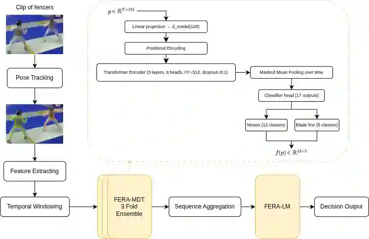翻译:许多多媒体任务将原始视频映射为结构化语义表示,以供下游决策使用。体育裁判是其中的典型应用场景,需要依据符号化规则对快速、细微的交互动作进行判罚。本文提出FERA(击剑裁判辅助系统),这是一种基于姿态的框架,可将广播级花剑击剑视频转化为动作标记及基于规则的解释说明。该系统从单目视频流中提取二维姿态,将其转换为101维运动学表征,并应用纯编码器Transformer模型(FERA-MDT)来识别每位运动员的步法动作、剑身动作及剑线位置。为获得两名运动员统一化的单人表征,FERA对每个视频片段及其水平翻转副本进行并行处理,无需多人姿态流程即可生成时间对齐的左右侧预测结果。动态时序窗口方案支持对未裁剪姿态轨迹进行推理。这些结构化预测结果将作为语言模型(FERA-LM)的输入标记,该模型通过简化的优先权规则生成文本判罚决策。在1,734个视频片段(含2,386个标注动作)的5折交叉验证中,FERA-MDT取得了0.549的宏观F1分数,优于BiLSTM和TCN基线模型。结合FERA-LM的完整流程在969次交锋中恢复了77.7%的裁判优先权判定准确率。FERA为双人运动中基于姿态的语义落地提供了案例研究基准,并展示了连接视频理解与规则推理的通用流程范式。