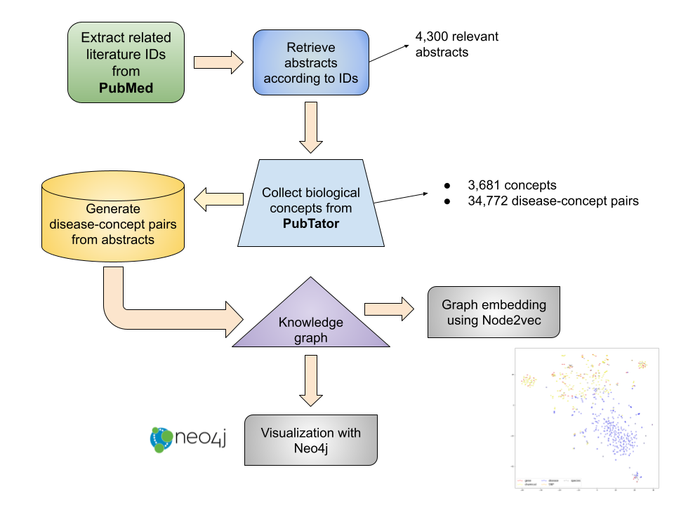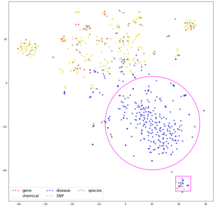 翻译:迄今为止,大多数神经退化性疾病都没有有效的治疗方法,但是,某些食物可能与这些疾病有关,并带来防止或推迟神经退化性发展的机会。我们的目标是利用文献挖掘研究神经退化性疾病与饮食的关系,以建立一个神经退化性疾病知识图。我们收集了4 300份出版物的摘要中与神经退化性疾病和饮食有关的生物医学说明(疾病、化学、基因、物种、SNP和Mutation)。 PubTator是一个由NIH支持的工具,可以从文献中提取生物医学概念。从这些说明中产生了一个知识图。然后,对图表嵌入者进行了“节点算法”培训,以支持潜在的概念组合和类似的概念识别。我们发现了一些可能来自饮食并对神经退化性疾病产生影响的与食物有关的物种和化学品。
