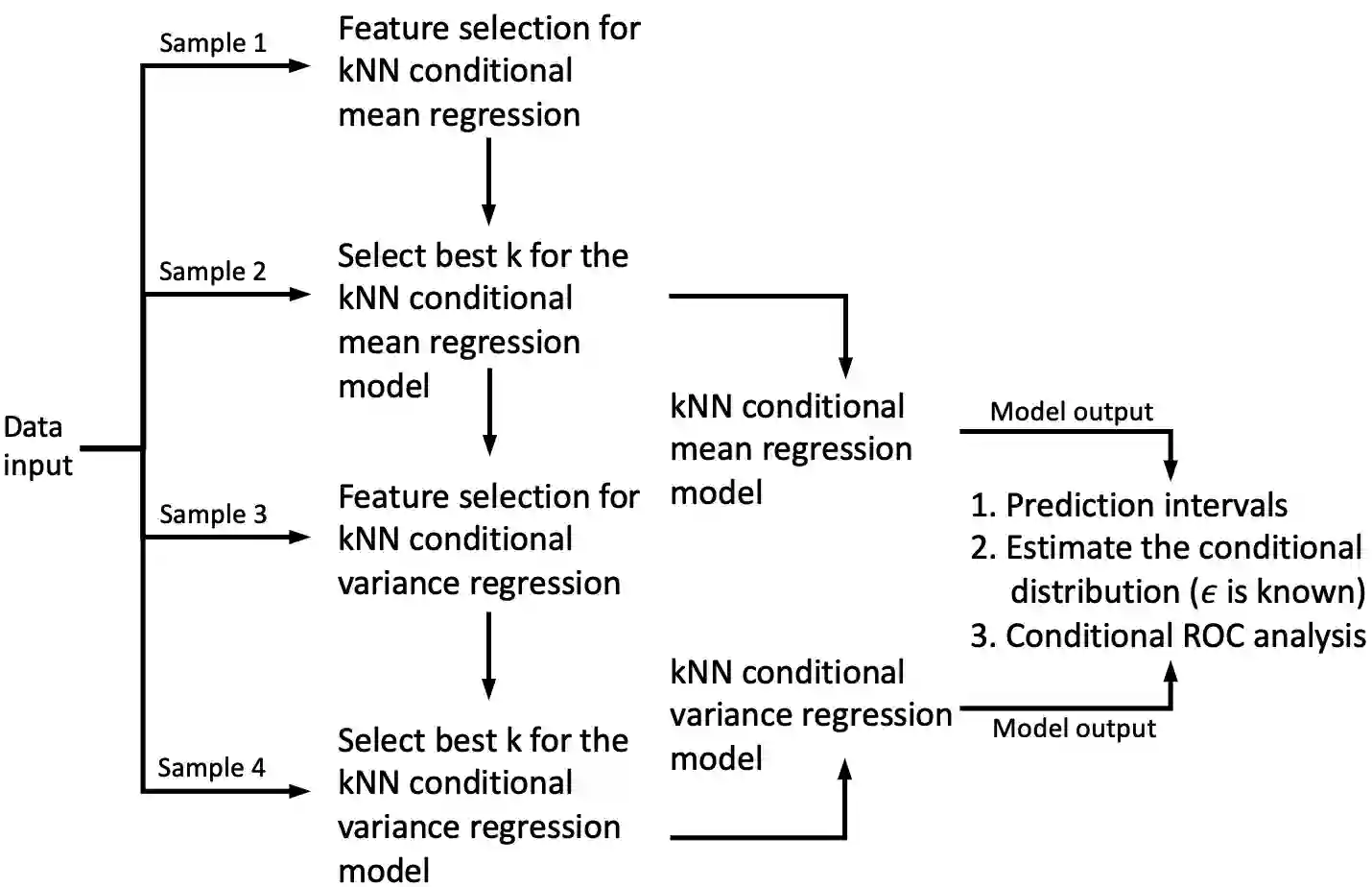 In this paper, we introduce a kNN-based regression method that synergizes the scalability and adaptability of traditional non-parametric kNN models with a novel variable selection technique. This method focuses on accurately estimating the conditional mean and variance of random response variables, thereby effectively characterizing conditional distributions across diverse scenarios.Our approach incorporates a robust uncertainty quantification mechanism, leveraging our prior estimation work on conditional mean and variance. The employment of kNN ensures scalable computational efficiency in predicting intervals and statistical accuracy in line with optimal non-parametric rates. Additionally, we introduce a new kNN semi-parametric algorithm for estimating ROC curves, accounting for covariates. For selecting the smoothing parameter k, we propose an algorithm with theoretical guarantees.Incorporation of variable selection enhances the performance of the method significantly over conventional kNN techniques in various modeling tasks. We validate the approach through simulations in low, moderate, and high-dimensional covariate spaces. The algorithm's effectiveness is particularly notable in biomedical applications as demonstrated in two case studies. Concluding with a theoretical analysis, we highlight the consistency and convergence rate of our method over traditional kNN models, particularly when the underlying regression model takes values in a low-dimensional space.