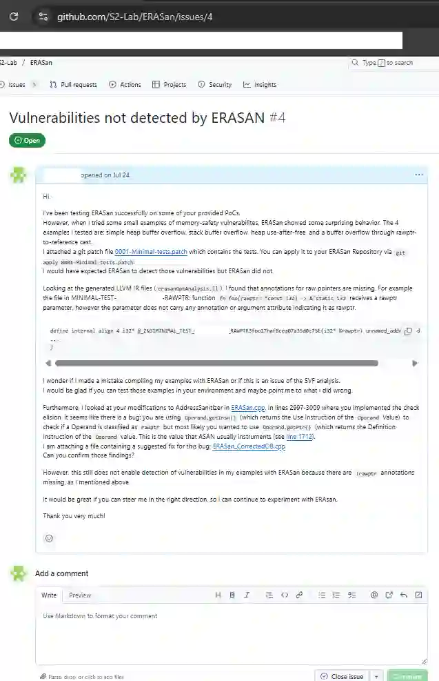 翻译:非安全Rust代码在与C/C++库互操作及实现底层数据结构时不可或缺,但它可能导致原本内存安全的Rust程序出现内存安全违规。净化器虽能在运行时捕获此类内存错误,但会对Rust类型系统已保证安全的内存访问引入大量不必要的检查。本文提出SafeFFI系统,通过优化Rust二进制文件中的内存安全检测机制,使检查仅发生在非安全代码与安全代码的边界处,从而将内存安全的保障职责从净化器移交至Rust类型系统。与既有方案不同,本设计避免了昂贵的全程序分析,并大幅降低编译时开销(仅2.64倍,而现有方案超过8.83倍)。在主流Rust代码库与已知漏洞代码集上的实验表明,SafeFFI在保持正确性并捕获所有时空内存安全违规的同时,较前沿系统实现了更优性能,将净化器检查减少高达98%。