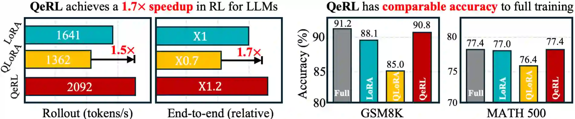 翻译:我们提出了QeRL,一种面向大语言模型(LLMs)的量化增强强化学习框架。虽然强化学习对于LLMs的推理能力至关重要,但其资源消耗巨大,需要大量的GPU内存和较长的推演时长。QeRL通过结合NVFP4量化与低秩适应(LoRA),解决了这些问题,加速了强化学习的推演阶段,同时降低了内存开销。除了效率提升之外,我们的研究发现量化噪声增加了策略熵,从而增强了探索能力,使得在强化学习过程中能够发现更优的策略。为了进一步优化探索,QeRL引入了自适应量化噪声(AQN)机制,该机制在训练过程中动态调整噪声。实验表明,QeRL在推演阶段实现了超过1.5倍的加速。此外,这是首个能够在单张H100 80GB GPU上对320亿参数LLM进行强化学习训练的框架,同时为强化学习训练带来了整体加速。与16位LoRA和QLoRA相比,它实现了更快的奖励增长和更高的最终准确率,并且在7B模型上,在GSM8K(90.8%)和MATH 500(77.4%)等数学基准测试中,其性能与全参数微调相当。这些结果确立了QeRL作为一个高效且有效的LLM强化学习训练框架的地位。