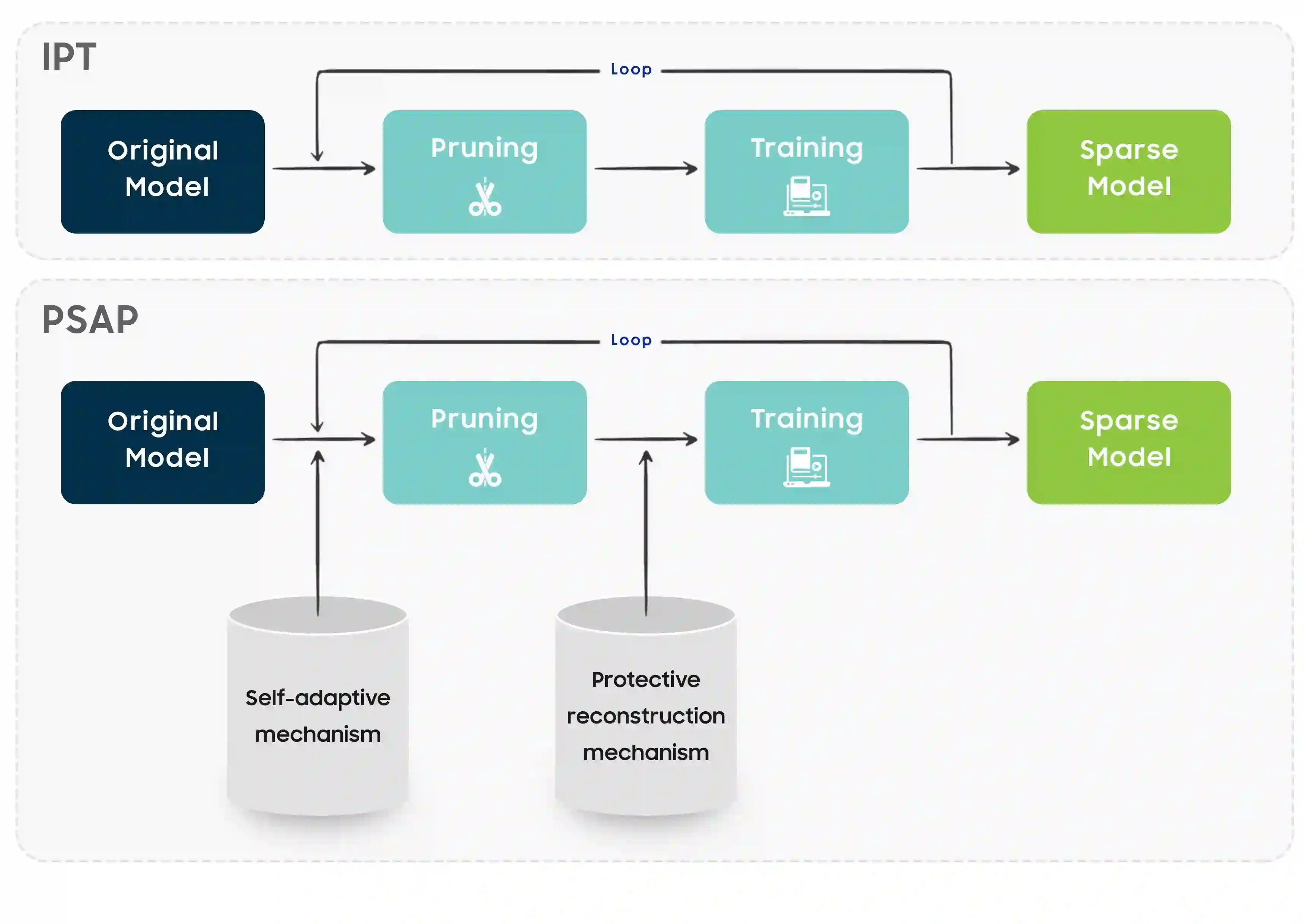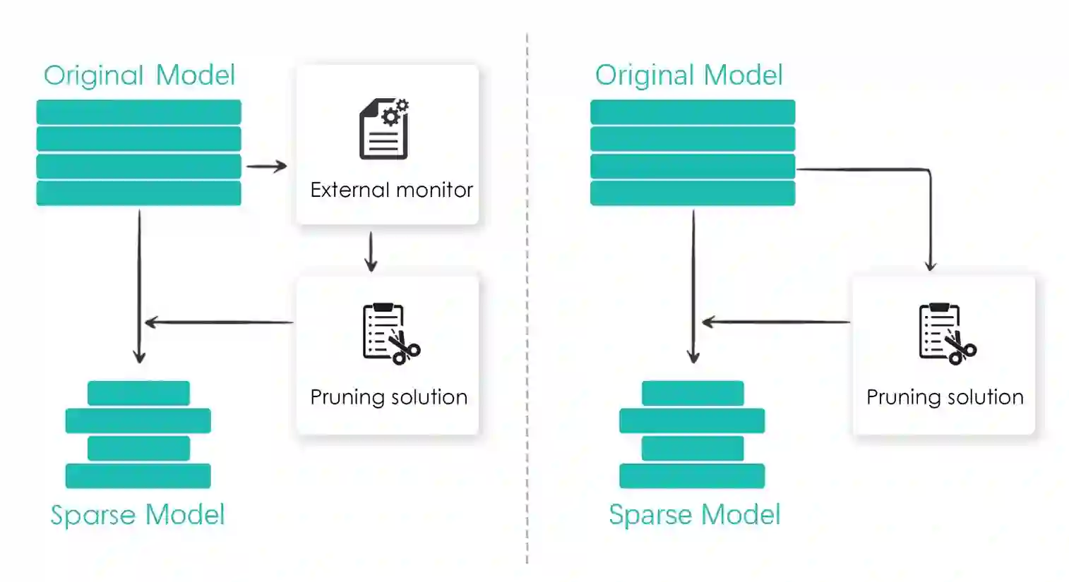 翻译:自适应网络剪枝方法因其优秀的能力来识别层和过滤器的重要性和冗余性并定制合适的剪枝方案而引起了极大的关注。然而,它仍然不尽如人意,因为当前的自适应剪枝方法大多依赖于额外的监视器来评估层和过滤器的重要性,因此面临着高复杂度和弱可解释性的问题。为解决这些问题,我们深入研究了迭代剪枝-训练过程中的权重重构过程,并提出了一种保护性自适应剪枝(PSAP)方法。首先,PSAP可以利用其自身信息,即权重稀疏性比率,来适应性地调整每个剪枝步骤之前的层剪枝比率。此外,我们提出了一种保护性重构机制,通过监督梯度来防止重要的过滤器被剪枝,并避免不可恢复的信息损失。我们的PSAP非常方便和明确,因为它仅依赖于模型本身的权重和梯度,而无需像早期作品那样需要额外的监视器。在ImageNet和CIFAR-10上的实验证明了它在精度和压缩比方面的优越性,尤其适用于高比率压缩或从头开始剪枝的情况。