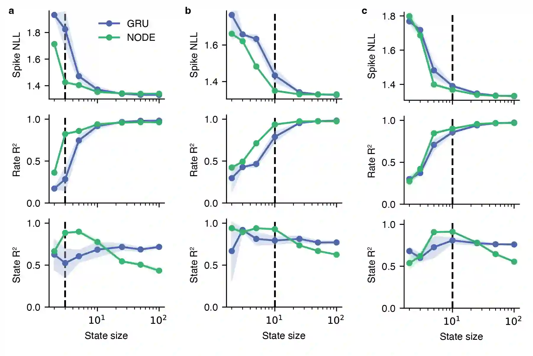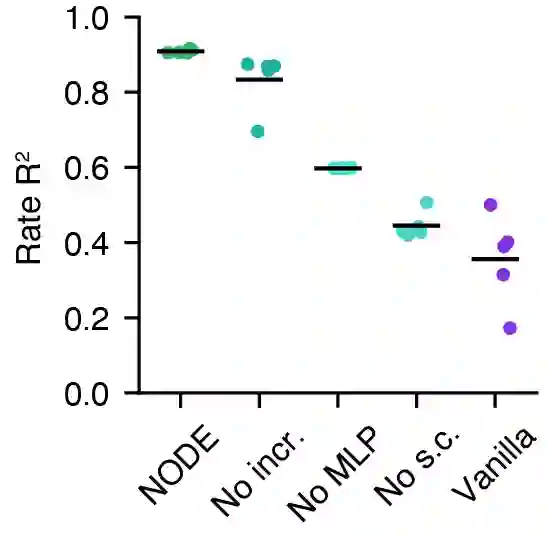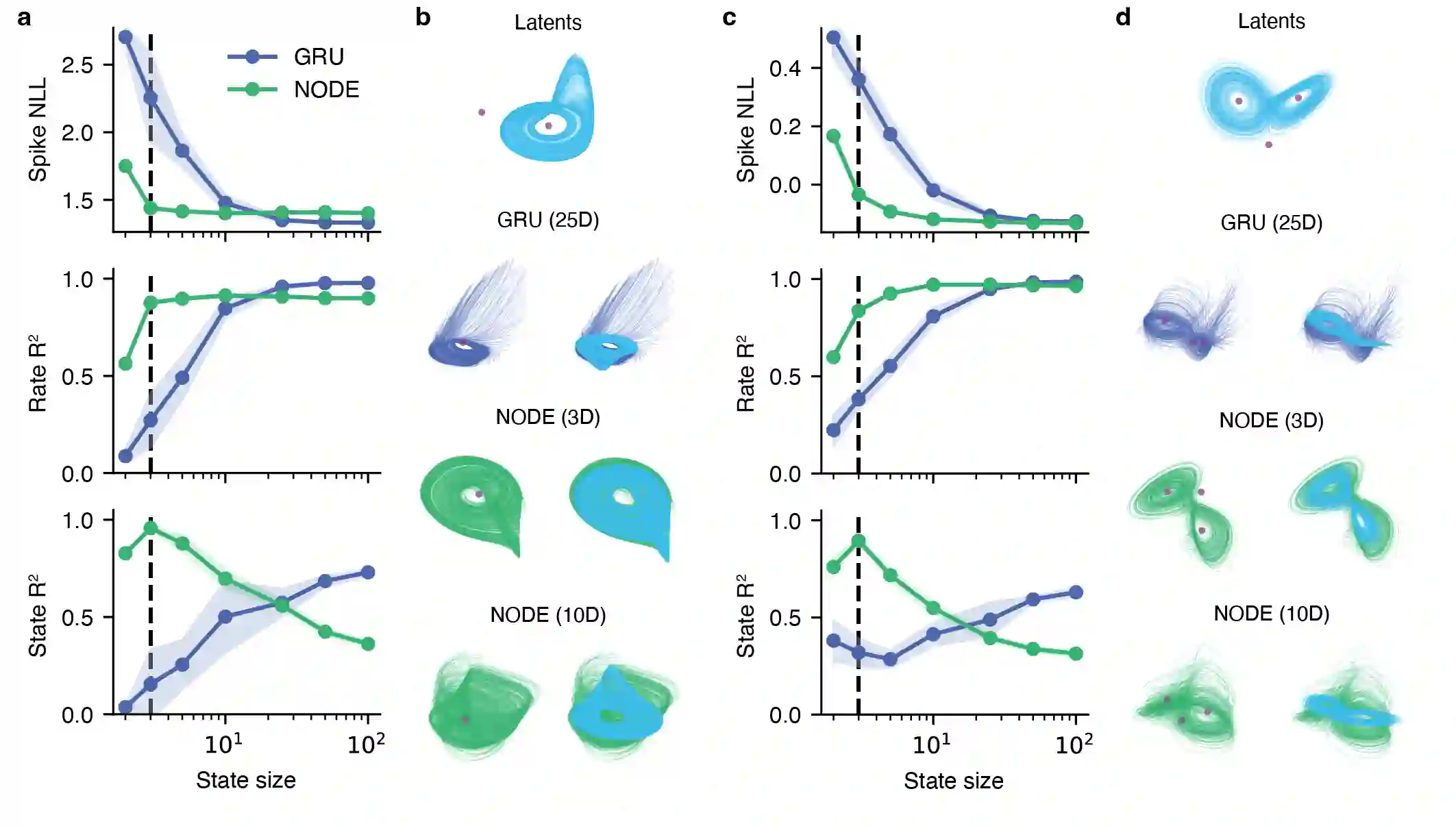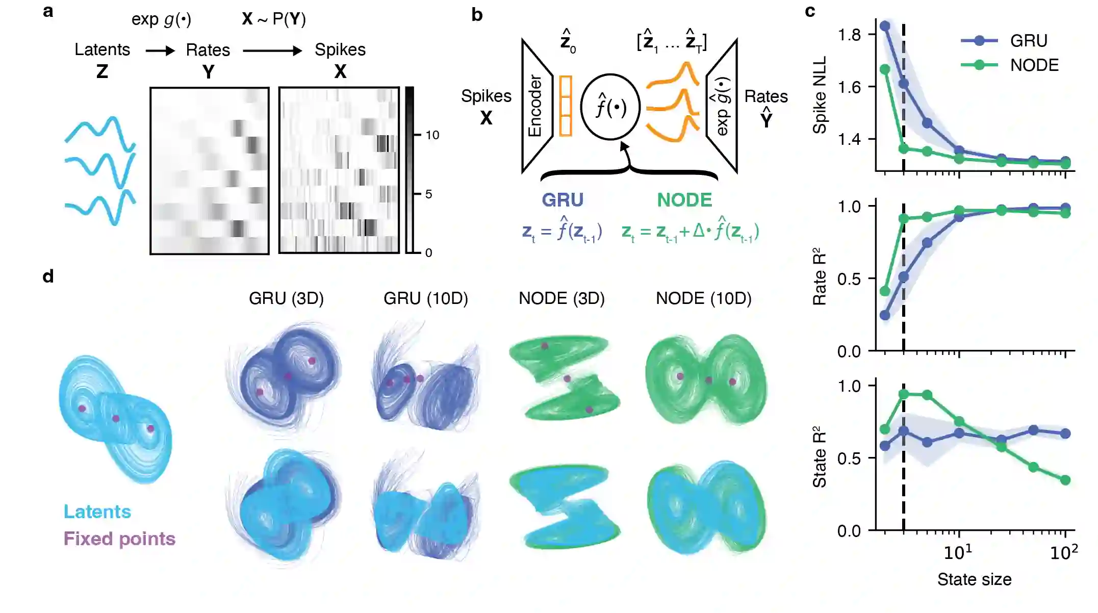 Artificial neural networks that can recover latent dynamics from recorded neural activity may provide a powerful avenue for identifying and interpreting the dynamical motifs underlying biological computation. Given that neural variance alone does not uniquely determine a latent dynamical system, interpretable architectures should prioritize accurate and low-dimensional latent dynamics. In this work, we evaluated the performance of sequential autoencoders (SAEs) in recovering latent chaotic attractors from simulated neural datasets. We found that SAEs with widely-used recurrent neural network (RNN)-based dynamics were unable to infer accurate firing rates at the true latent state dimensionality, and that larger RNNs relied upon dynamical features not present in the data. On the other hand, SAEs with neural ordinary differential equation (NODE)-based dynamics inferred accurate rates at the true latent state dimensionality, while also recovering latent trajectories and fixed point structure. Ablations reveal that this is mainly because NODEs (1) allow use of higher-capacity multi-layer perceptrons (MLPs) to model the vector field and (2) predict the derivative rather than the next state. Decoupling the capacity of the dynamics model from its latent dimensionality enables NODEs to learn the requisite low-D dynamics where RNN cells fail. Additionally, the fact that the NODE predicts derivatives imposes a useful autoregressive prior on the latent states. The suboptimal interpretability of widely-used RNN-based dynamics may motivate substitution for alternative architectures, such as NODE, that enable learning of accurate dynamics in low-dimensional latent spaces.