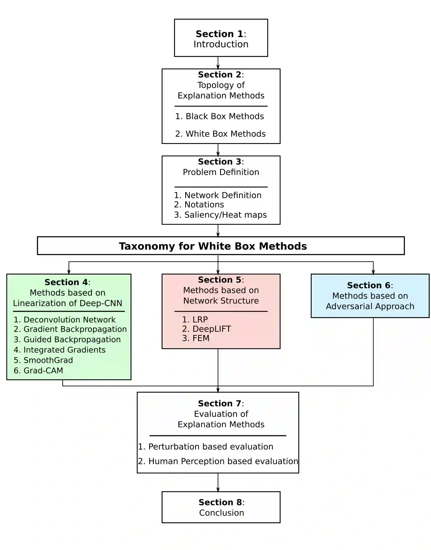 In recent years, deep learning has become prevalent to solve applications from multiple domains. Convolutional Neural Networks (CNNs) particularly have demonstrated state of the art performance for the task of image classification. However, the decisions made by these networks are not transparent and cannot be directly interpreted by a human. Several approaches have been proposed to explain to understand the reasoning behind a prediction made by a network. In this paper, we propose a topology of grouping these methods based on their assumptions and implementations. We focus primarily on white box methods that leverage the information of the internal architecture of a network to explain its decision. Given the task of image classification and a trained CNN, this work aims to provide a comprehensive and detailed overview of a set of methods that can be used to create explanation maps for a particular image, that assign an importance score to each pixel of the image based on its contribution to the decision of the network. We also propose a further classification of the white box methods based on their implementations to enable better comparisons and help researchers find methods best suited for different scenarios.