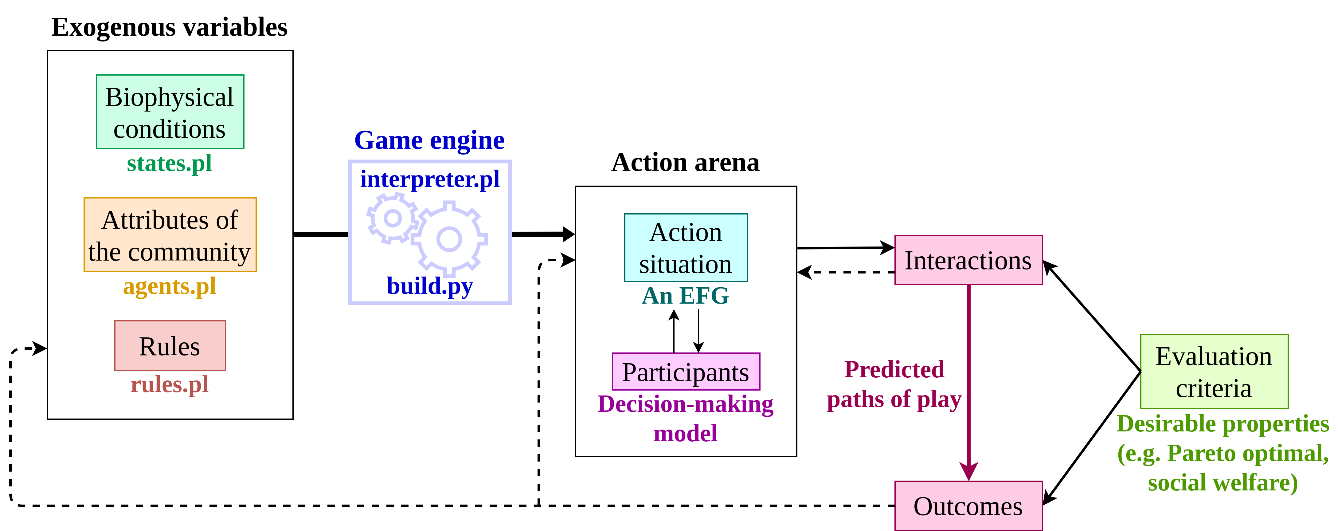 翻译:机构分析和发展框架(IAD)是Elinor Ostrom及其同事提出的一个概念工具箱,目的是确定和界定构成人类互动千差万别结构的普遍共同变量。框架将规则确定为确定互动结构的核心概念之一,并承认其有潜力引导社区实现更有益、更可取的社会理想成果。这项工作首次尝试将IAD框架转化为计算模型,使代理群体能够正式进行对特定规则配置的如果分析。为此,我们界定了行动状况语言 -- -- 或ASL -- -- 其语法几乎适合IAD框架的构成部分,并用于描述社会互动。ASL得到一个游戏引擎的补充,该游戏引擎生成其语义作为广泛的游戏。然后,这些模型可以使用标准游戏理论工具进行分析,以预测哪些成果最受激励,并根据其社会相关特性进行评估。