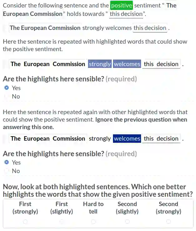 翻译:虽然对文字情绪分类的一般任务进行了广泛研究,但研究更没有具体地审视特定来源和目标之间的情绪。为了解决这一问题,我们试验了一种最先进的提取关系模型。令人惊讶的是,我们发现,尽管表现合理,但模型的注意力往往系统地与有助于情感的词语不相符。因此,我们直接用人的理由来训练模型的注意力,并用我们确定的所有数据组任务4~8点来改进我们的模型性能。我们还用新颖和直观的衡量尺度对模型的注意力进行了严格分析,既经过训练,又未经训练。我们的结果显示,未经训练的注意力并不能提供忠实的解释;然而,经过训练的注意力不仅简要地说明人的理由,不仅提高了业绩,而且还带来了忠实的解释。令人鼓舞的是,少量附加说明的人类理由足以纠正我们任务中的注意力。