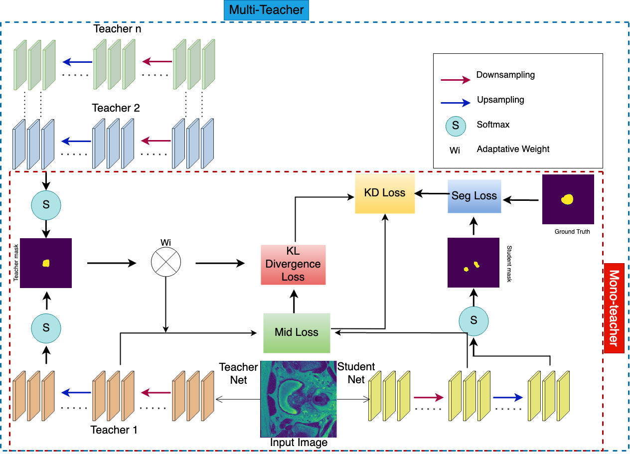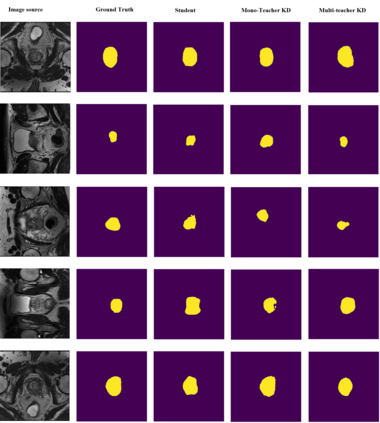 翻译:在许多医学任务中,深度模型的性能最近经历了相当大的提高。这些模型通常是熟练的学习者。然而,它们复杂的架构设计和高计算复杂度使得在临床设置中部署它们具有挑战性,特别是对于资源有限的设备。为了解决这个问题,知识蒸馏(KD)被提出作为压缩方法和加速技术。KD是一种有效的学习策略,可以从一个复杂的模型(即教师模型)转移知识到一个轻型模型(即学生模型)。因此,我们可以获得具有低参数的紧凑型模型,同时保持教师的性能。因此,我们在这项工作中开发了一种基于KD的前列腺MRI分割深度模型,通过将基于特征的蒸馏与KL散度、Loavsz和Dice损失相结合来实现。我们进一步演示了它的有效性,通过应用两种压缩过程:1)从单个经过良好训练的教师中向学生模型蒸馏知识,2)由于大多数医疗应用的数据集很小,我们训练多个教师,每个教师使用少量图像进行训练,以尽可能接近教师的自适应学生模型,考虑所需的准确性和快速推理时间。在公共的多中心前列腺肿瘤数据集上进行了广泛的实验,结果表明所提出的自适应KD策略将Dice相似度得分提高了9%,优于所有测试的成熟基线模型。