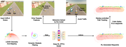 翻译:我们着手处理一个迄今未报告的自主机器人(自驾驶车)在动态场景中航行的问题,以减少其定位错误和最终的累积性漂移或绝对轨迹错误,这在动态场景中已经显露出来。以极受欢迎的Velodyne-16 3D LIDAR作为主要感知模式,以及精确的LIDAR定位和绘图算法,作为国家估计框架,LOAM显示,在没有导航政策的情况下,在移动物体面前迅速漂移。要克服这一点,我们通过一套适当的奖赏和惩罚功能,学习导致漂移最小化的导航的行动。我们使用一种深强化学习方法,即Proximal政策优化,以学习导致漂移最小化轨迹的行动。我们通过对通过CARLA模拟器提供的合成的、但具有照片现实性的场景进行广泛比较,展示了拟议框架优于不采用这种政策的方法的优异性。