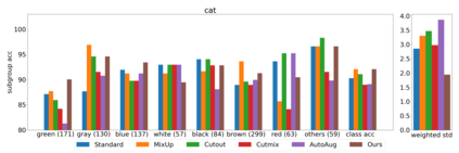 翻译:为了弥补这一差距,我们首先调查自然背景颜色如何在图像分类任务中扮演虚假特征,例如学习假相亲,而不是学习输入/产出对配之间的正确关系。我们以前曾对稳健性研究数据集进行了研究,这些数据集混合了低层次特征,以量化虚假性关联如何影响预测,而不是考虑自然语义因素,因为获取现实的数据集以进行全面评价受到限制。为了缩小这一差距,我们在本文件中首先调查自然背景颜色如何通过手工将CIFAR10 和 CIFAR100 的测试组分解成基于每张图像背景颜色的分组。我们命名了我们的数据集 CIFAR10-B 和 CIFAR100-B 。我们发现,虽然标准CNN达到了人的准确性能,但分组的性能却不一致,甚至在数据扩充(DA)。为了缓解这一问题,我们建议FlowAug, 一种以精细性DA方法来利用通过事先训练的精准性能变异性变异性变异性表示。实验结果表明,FLAL-FAL-S-S-S-SDA(我们从其他类型的更一致的直系)分组取得更好的结果。我们更一致的比其他类型的直系更一致化结果,在CAR10 和CFAL-ILDRDO 上显示一般的性变的性变现数据。
