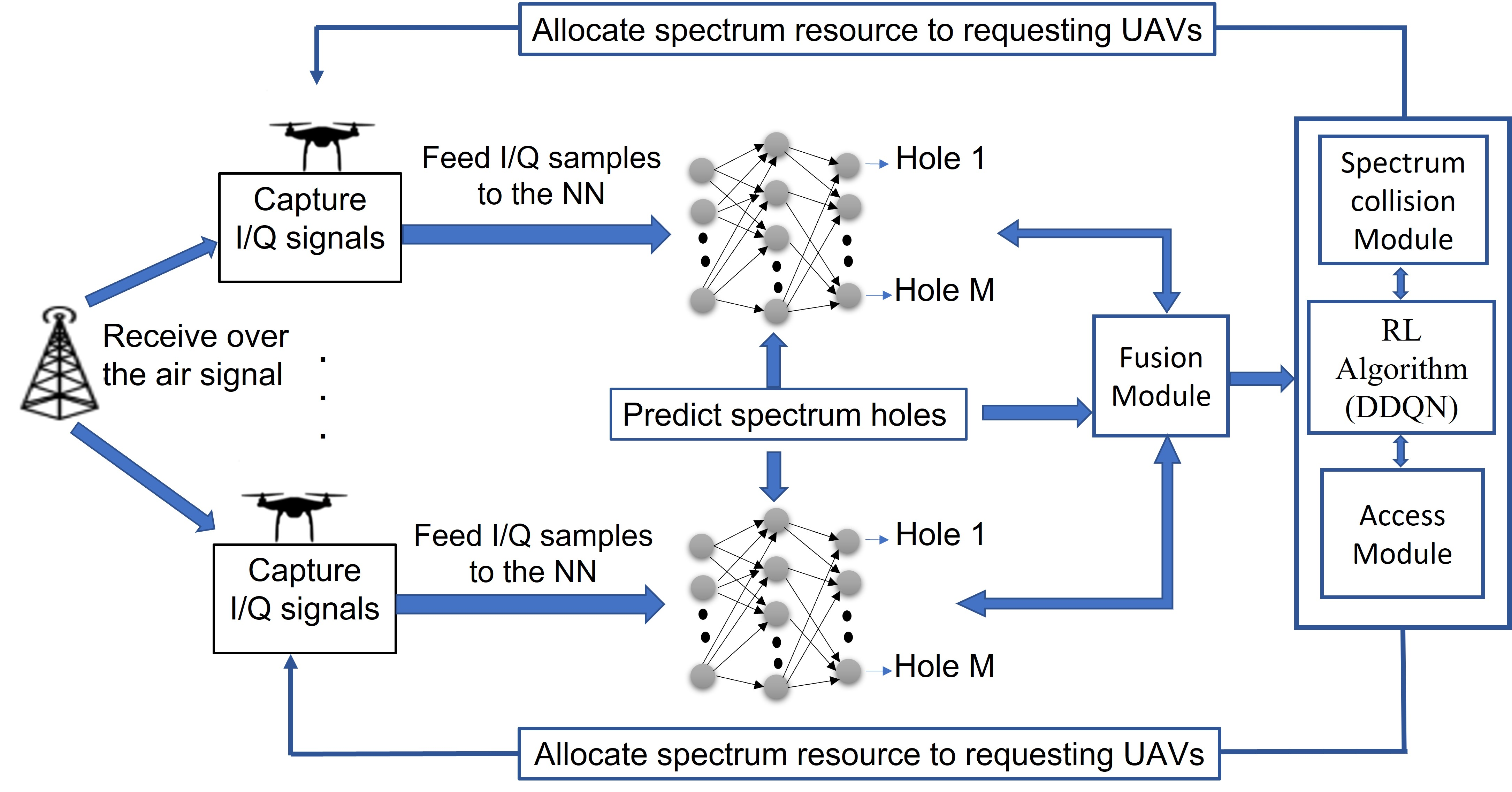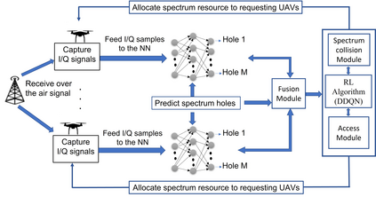 In this paper, we propose a data-driven framework for collaborative wideband spectrum sensing and scheduling for networked unmanned aerial vehicles (UAVs), which act as the secondary users to opportunistically utilize detected spectrum holes. To this end, we propose a multi-class classification problem for wideband spectrum sensing to detect vacant spectrum spots based on collected I/Q samples. To enhance the accuracy of the spectrum sensing module, the outputs from the multi-class classification by each individual UAV are fused at a server in the unmanned aircraft system traffic management (UTM) ecosystem. In the spectrum scheduling phase, we leverage reinforcement learning (RL) solutions to dynamically allocate the detected spectrum holes to the secondary users (i.e., UAVs). To evaluate the proposed methods, we establish a comprehensive simulation framework that generates a near-realistic synthetic dataset using MATLAB LTE toolbox by incorporating base-station~(BS) locations in a chosen area of interest, performing ray-tracing, and emulating the primary users channel usage in terms of I/Q samples. This evaluation methodology provides a flexible framework to generate large spectrum datasets that could be used for developing ML/AI-based spectrum management solutions for aerial devices.