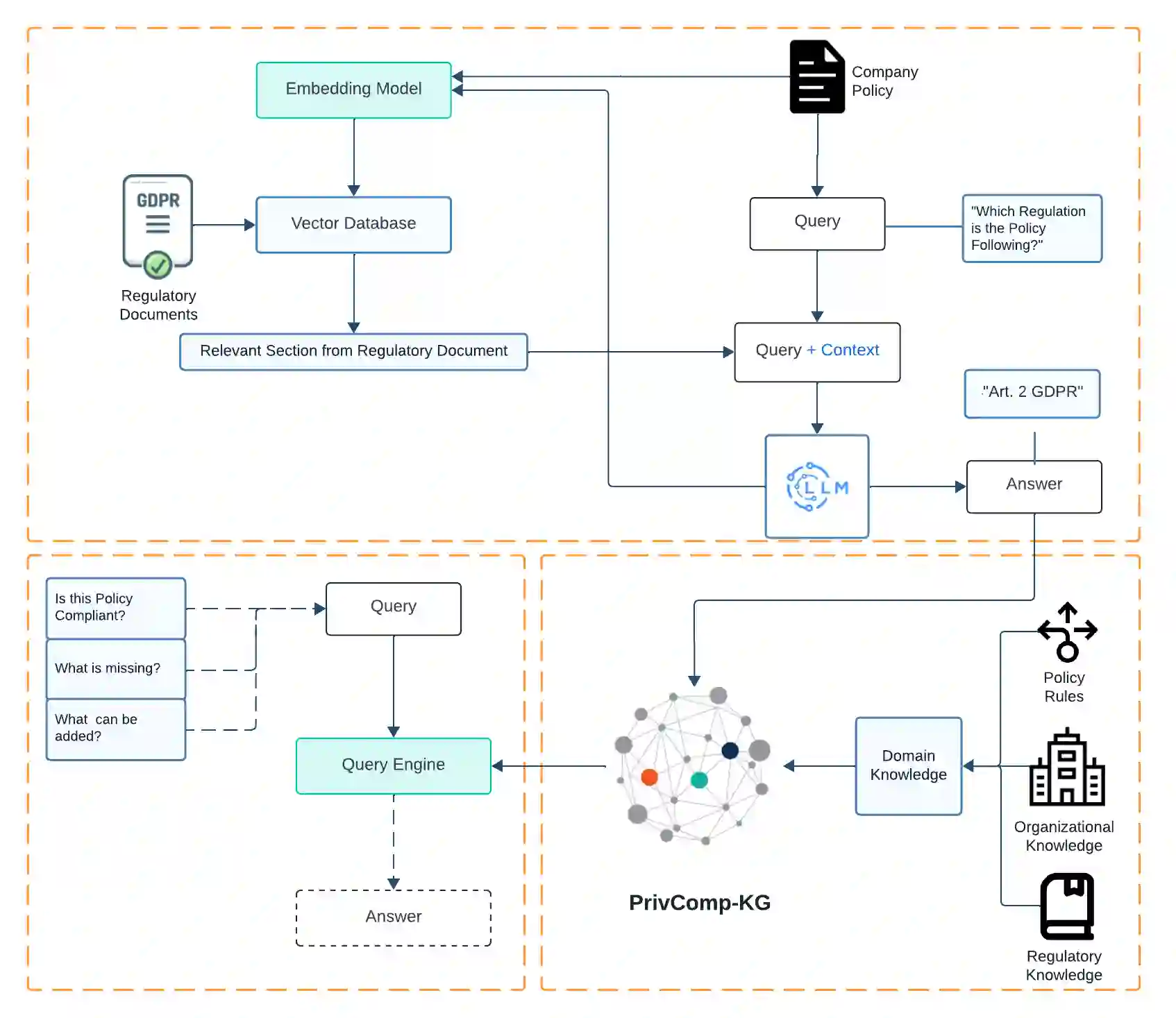 Data protection and privacy is becoming increasingly crucial in the digital era. Numerous companies depend on third-party vendors and service providers to carry out critical functions within their operations, encompassing tasks such as data handling and storage. However, this reliance introduces potential vulnerabilities, as these vendors' security measures and practices may not always align with the standards expected by regulatory bodies. Businesses are required, often under the penalty of law, to ensure compliance with the evolving regulatory rules. Interpreting and implementing these regulations pose challenges due to their complexity. Regulatory documents are extensive, demanding significant effort for interpretation, while vendor-drafted privacy policies often lack the detail required for full legal compliance, leading to ambiguity. To ensure a concise interpretation of the regulatory requirements and compliance of organizational privacy policy with said regulations, we propose a Large Language Model (LLM) and Semantic Web based approach for privacy compliance. In this paper, we develop the novel Privacy Policy Compliance Verification Knowledge Graph, PrivComp-KG. It is designed to efficiently store and retrieve comprehensive information concerning privacy policies, regulatory frameworks, and domain-specific knowledge pertaining to the legal landscape of privacy. Using Retrieval Augmented Generation, we identify the relevant sections in a privacy policy with corresponding regulatory rules. This information about individual privacy policies is populated into the PrivComp-KG. Combining this with the domain context and rules, the PrivComp-KG can be queried to check for compliance with privacy policies by each vendor against relevant policy regulations. We demonstrate the relevance of the PrivComp-KG, by verifying compliance of privacy policy documents for various organizations.
