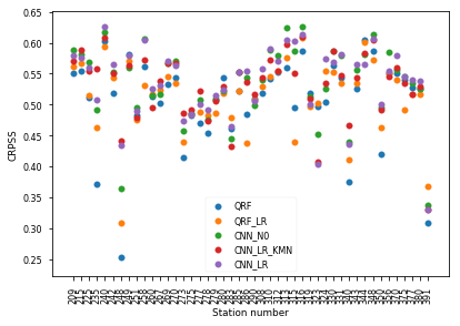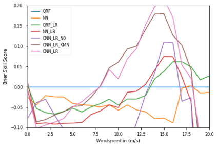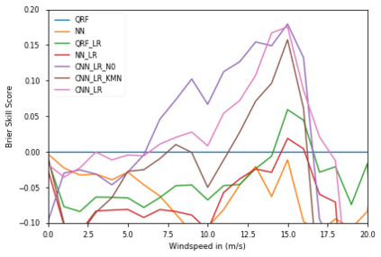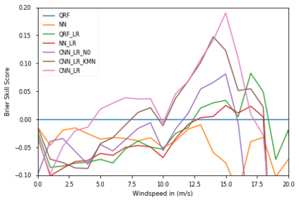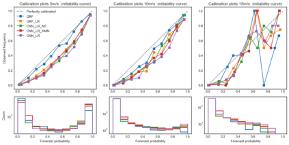 翻译:用于概率天气预报的现有统计后处理方法无法使用数字天气预测(NWP)模型中的全部空间模式。在本文中,我们通过使用进化神经网络(CNNs)纳入空间风速信息,并根据KNMI的确定性和谐-Arome NWP模型,对荷兰未来48小时的风速进行概率预测。CNNs的概率预测显示,中风至高风速的比值更高,以及比完全相连的神经网络和量回归森林的预测更连续的概率分数(CRPS)和对数分。作为第二结果,我们用三种不同的密度估计方法(量化软式软式(QS)、内核混合物网络,并适合流式正常分布)对CNN进行了比较,发现基于QS方法的概率预测最好。