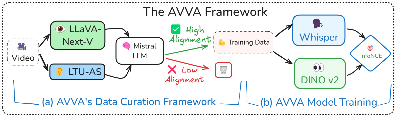 Integrating audio and visual data for training multimodal foundational models remains a challenge. The Audio-Video Vector Alignment (AVVA) framework addresses this by considering AV scene alignment beyond mere temporal synchronization, and leveraging Large Language Models (LLMs) for data curation. AVVA implements a scoring mechanism for selecting aligned training data segments. It integrates Whisper, a speech-based foundation model, for audio and DINOv2 for video analysis in a dual-encoder structure with contrastive learning on AV pairs. Evaluations on AudioCaps, VALOR, and VGGSound demonstrate the effectiveness of the proposed model architecture and data curation approach. AVVA achieves a significant improvement in top-k accuracies for video-to-audio retrieval on all datasets compared to DenseAV, while using only 192 hrs of curated training data. Furthermore, an ablation study indicates that the data curation process effectively trades data quality for data quantity, yielding increases in top-k retrieval accuracies on AudioCaps, VALOR, and VGGSound, compared to training on the full spectrum of uncurated data.