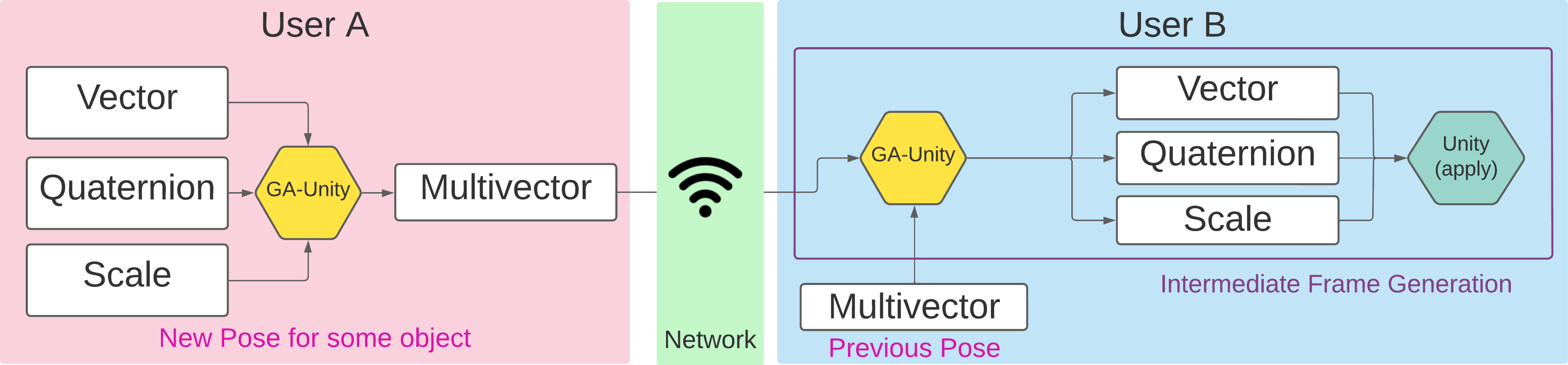 This paper introduces GA-Unity, the first Unity package specifically designed for seamless integration of Geometric Algebra (GA) into collaborative networked applications. Indeed, in such contexts, it has been demonstrated that using multivectors for interpolation between transmitted poses reduces runtime by 16% and bandwidth usage by an average of 50% compared to traditional representation forms (vectors and quaternions); we demonstrate that GA-Unity further enhances runtime performance. Tailored for 3D Conformal Geometric Algebra, GA-Unity also offers an intuitive interface within the Unity game engine, simplifying GA integration for researchers and programmers. By eliminating the need for users to develop GA functionalities from scratch, GA-Unity expedites GA experimentation and implementation processes. Its seamless integration enables easy representation of transformation properties using multivectors, facilitating deformations and interpolations without necessitating modifications to the rendering pipeline. Furthermore, its graphical interface establishes a GA playground for developers within the familiar confines of a modern game engine. In summary, GA-Unity represents a significant advancement in GA accessibility and usability, particularly in collaborative networked environments, empowering innovation and facilitating widespread adoption across various research and programming domains while upholding high-performance standards.
