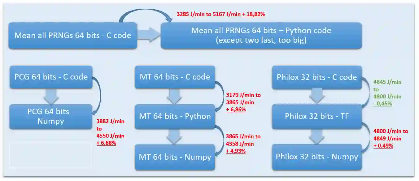 Pseudo-Random Number Generators (PRNGs) have become ubiquitous in machine learning technologies because they are interesting for numerous methods. The field of machine learning holds the potential for substantial advancements across various domains, as exemplified by recent breakthroughs in Large Language Models (LLMs). However, despite the growing interest, persistent concerns include issues related to reproducibility and energy consumption. Reproducibility is crucial for robust scientific inquiry and explainability, while energy efficiency underscores the imperative to conserve finite global resources. This study delves into the investigation of whether the leading Pseudo-Random Number Generators (PRNGs) employed in machine learning languages, libraries, and frameworks uphold statistical quality and numerical reproducibility when compared to the original C implementation of the respective PRNG algorithms. Additionally, we aim to evaluate the time efficiency and energy consumption of various implementations. Our experiments encompass Python, NumPy, TensorFlow, and PyTorch, utilizing the Mersenne Twister, PCG, and Philox algorithms. Remarkably, we verified that the temporal performance of machine learning technologies closely aligns with that of C-based implementations, with instances of achieving even superior performances. On the other hand, it is noteworthy that ML technologies consumed only 10% more energy than their C-implementation counterparts. However, while statistical quality was found to be comparable, achieving numerical reproducibility across different platforms for identical seeds and algorithms was not achieved.