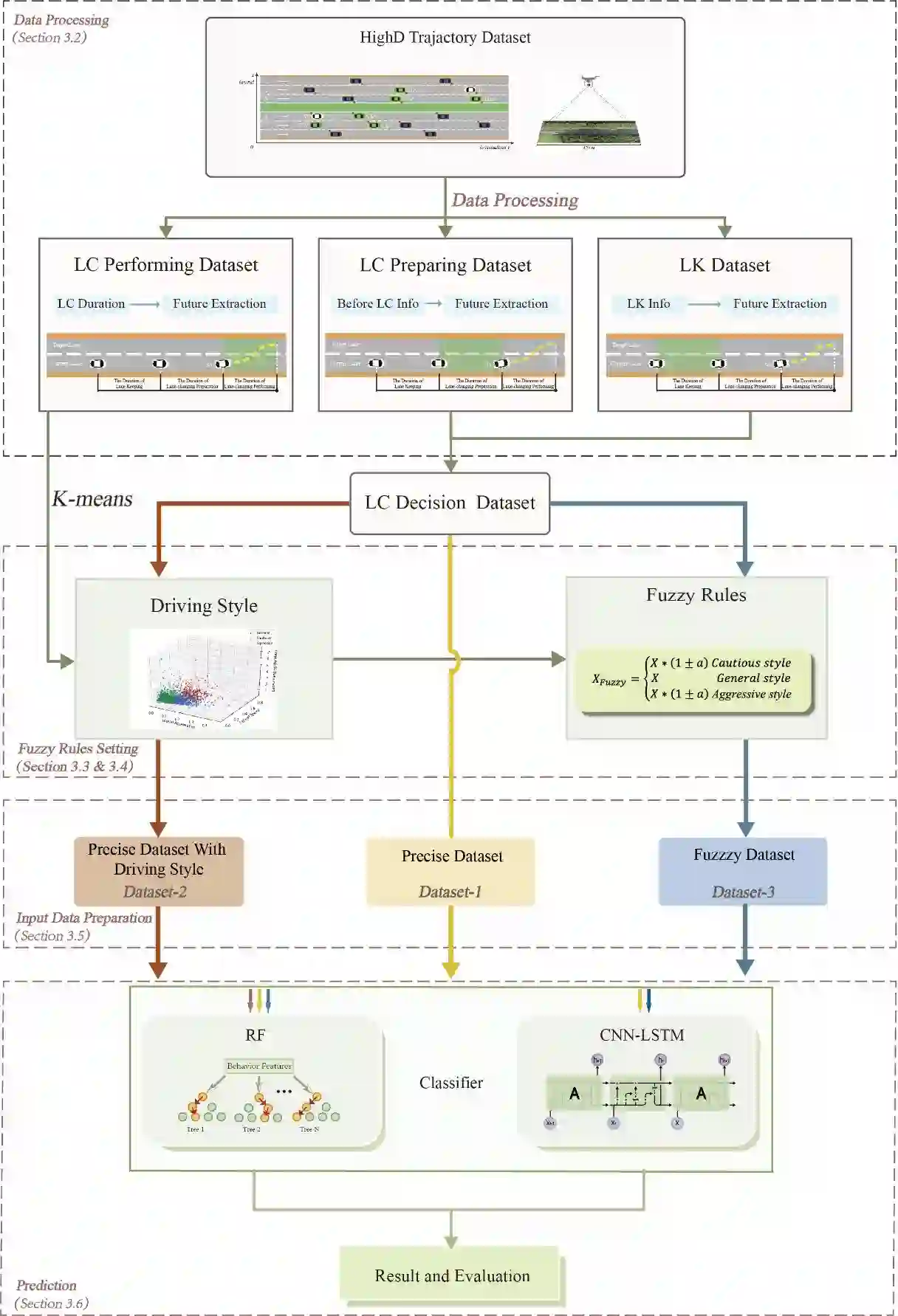 翻译:人工智能算法在智能运输领域广泛应用,特别是用于驾驶行为分析和预测。本研究提出了一个新框架,将模糊的轨迹数据、不受监督的学习和监督下的学习方法结合起来,以预测多驱动风格的车道变化行为。高空高空数据(HighD)的微镜轨迹数据被用于构建两类数据集,包括精确的轨迹数据集和路道变化预测模型的模糊轨迹数据集。模糊的轨迹数据是根据不同驾驶风格开发的,由K- means算法组成。两种典型的受监督的学习方法,包括随机森林和长期短期内存,与电动神经网络相结合,被进一步应用于改变车道行为预测。结果显示:(1) 拟议的集成方法比常规的航道变化预测要好;(2) 相对速度的特征在根据以驾驶风格为基础的模糊规则处理后,对车道变化预测做出更大的贡献;(3) 驾驶风格的差异更多地反映于车道变化的后期,而不是车道变化。