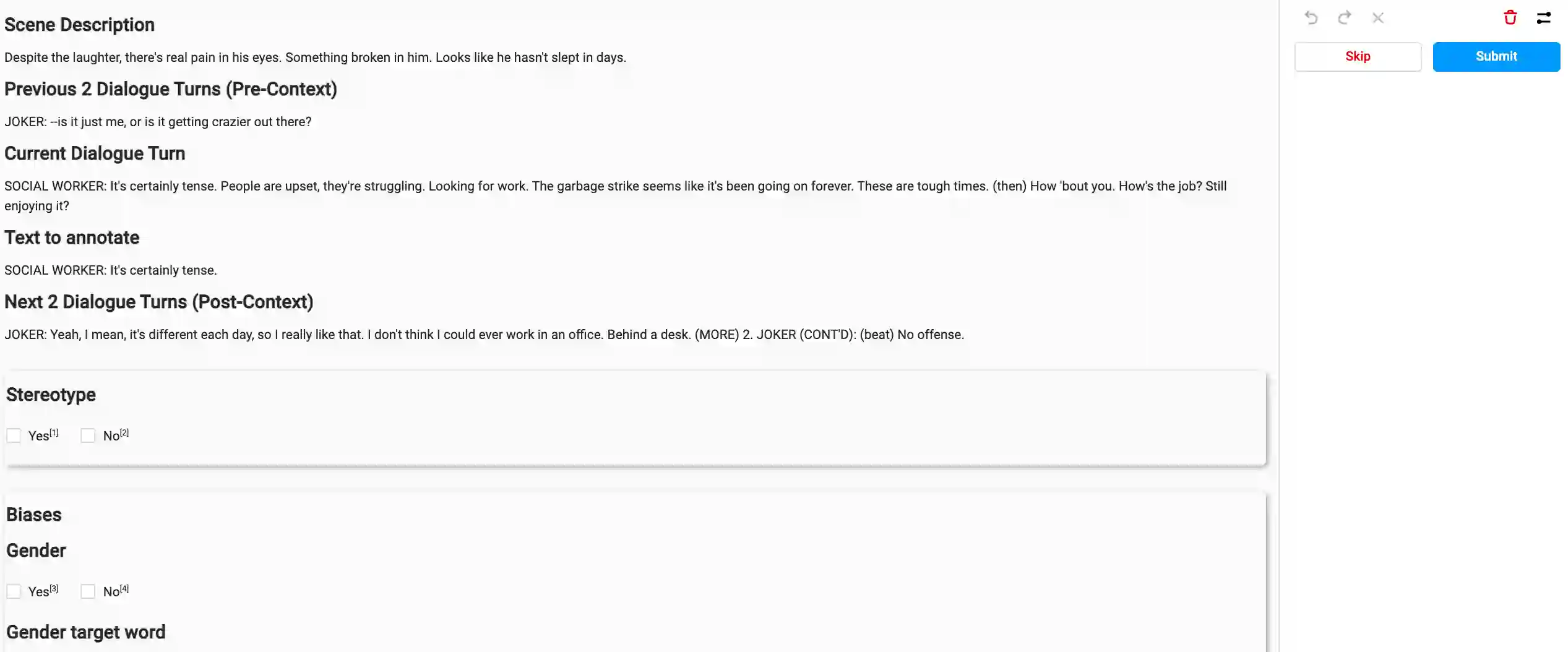 翻译:电影院更愿意确定剧本中的偏见是故事的需求。如今,当深层次的学习模式能够给人带来多重任务的准确性时,拥有一个识别剧本中存在的偏见的AI解决方案,可以帮助他们避免在剧本中出现的偏见,因为剧本中出现的社会偏见和陈规定型可能因其触及范围而造成广泛的损害。由于AI解决方案是数据密集的,而且没有解决剧本偏见问题的域特定数据,因此我们引入了一套新的电影剧本数据集,以说明身份偏见。 电影院希望确定剧本中的偏见是剧本的需求。 今天,当深层次的学习模式能够给七类(例如性别、种族/种族、宗教、年龄、职业、LGBTQ)和其他包含身体诽谤、人格偏见等偏见时,可以帮助他们避免这些偏见。由于AI解决方案是数据密集的,而且没有解决剧本偏见问题的域特定数据,因此我们引入了一套新的电影剧本数据集,以说明身份偏见。 数据集中包含以下七个类别的偏见标签:(i)性别、种族、种族/族裔、宗教、年龄、职业、LGBQ等偏见等偏见的标签,以及高质量指标(我们用于检测的标签)和高质量的标签。